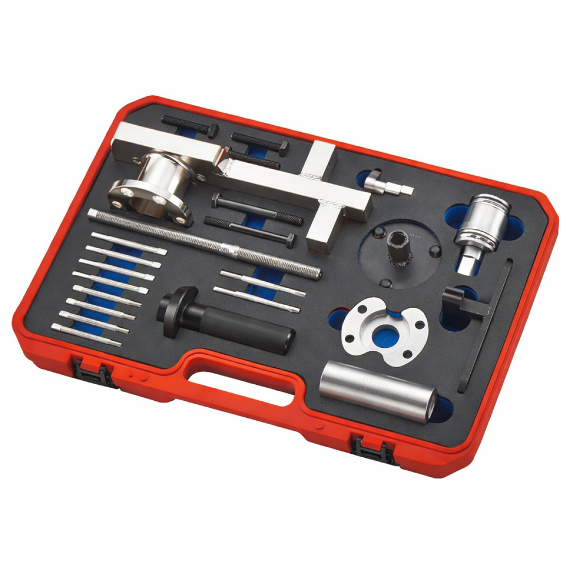 Шкив коленчатого вала на этих двигателях затягивается с моментом 200 Нм + 270°, поэтому для безопасного демонтажа необходим специальный надежный фиксатор, входящий в комплект. Также набор содержит элементы съемника для снятия шкива без повреждений.