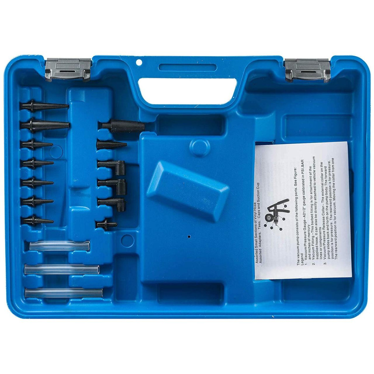 Металлический ручной насос с манометром позволяет создавать как разрежение, так и давление, обеспечивая точную диагностику без демонтажа узлов. Набор подходит для профессионального использования на СТО и в частных мастерских.