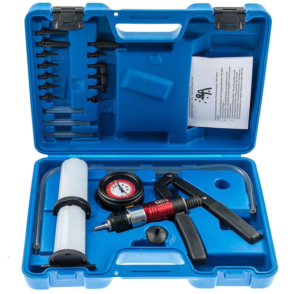 Профессиональный набор SATRA S-90064 предназначен для проверки вакуумных систем, герметичности узлов, а также для прокачки и замены тормозной жидкости. Инструмент широко применяется при диагностике и обслуживании тормозных систем, вакуумных клапанов, регуляторов давления, модуляторов, карбюраторов и элементов впускной системы.