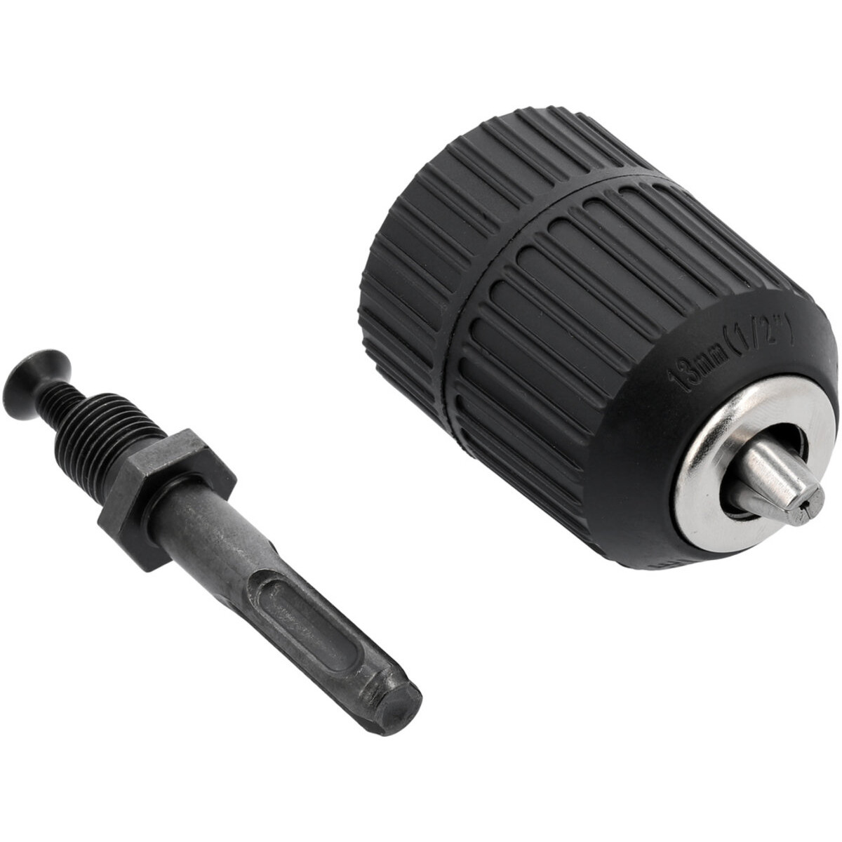 Имеет резьбовое крепление 1/2" 20UNF (G1/2-20UNF) и поддерживает сверла диаметром от 1,5 до 13 мм. Изготовлен из высококачественной углеродистой стали, устойчивой к износу. Адаптер SDS-Plus выполнен из прочной стали Cr40.