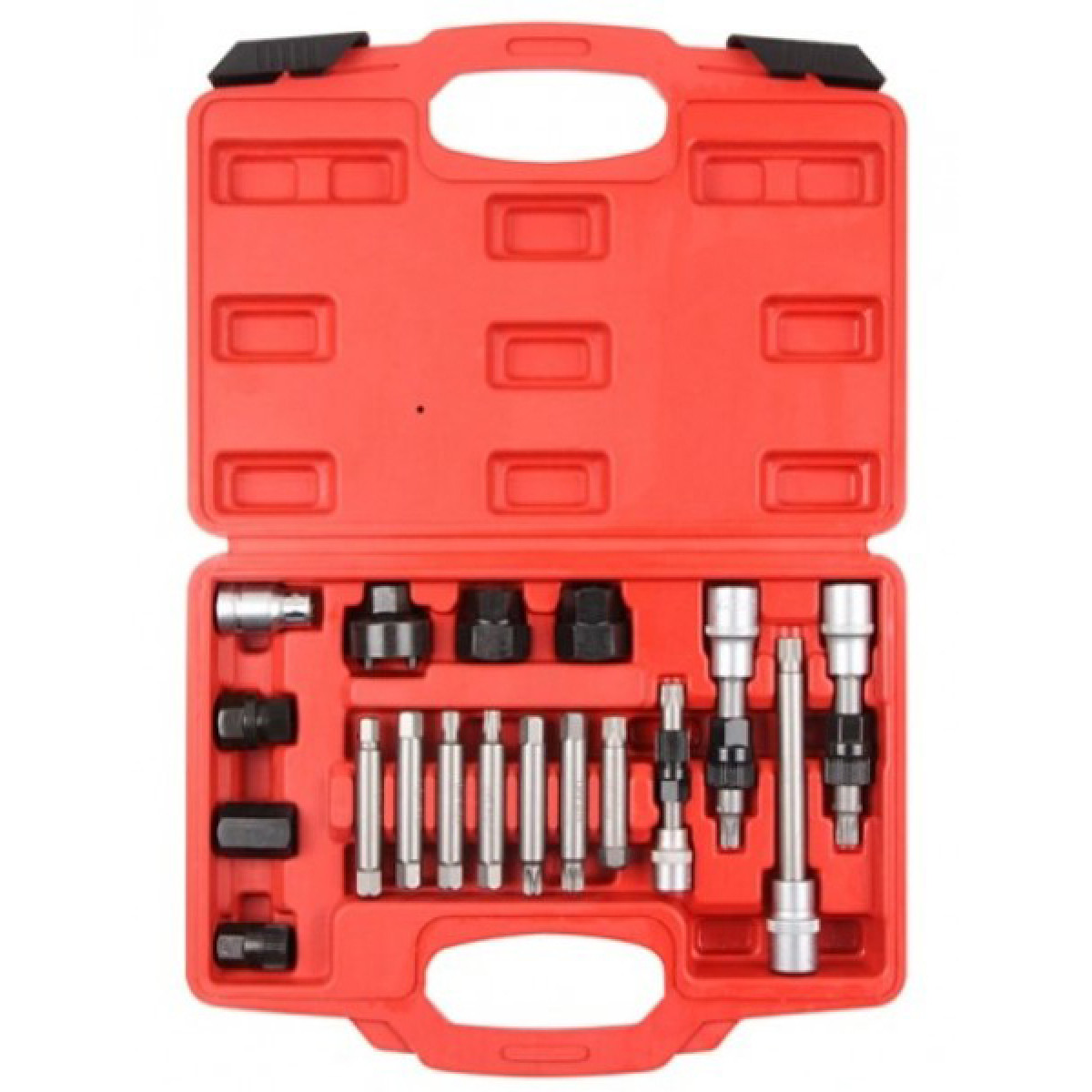 Набор для разборки генераторов - расширенный профессиональный комплект из для снятия и установки шкивов/роликов генератора и муфт свободного хода. Специальные комбинированные насадки с коронкой позволяют и , а удлинённые вставки помогают при демонтаже. Посадки и и профили делают набор универсальным для большинства типов генераторов. Поставляется в прочном кейсе для удобного хранения.