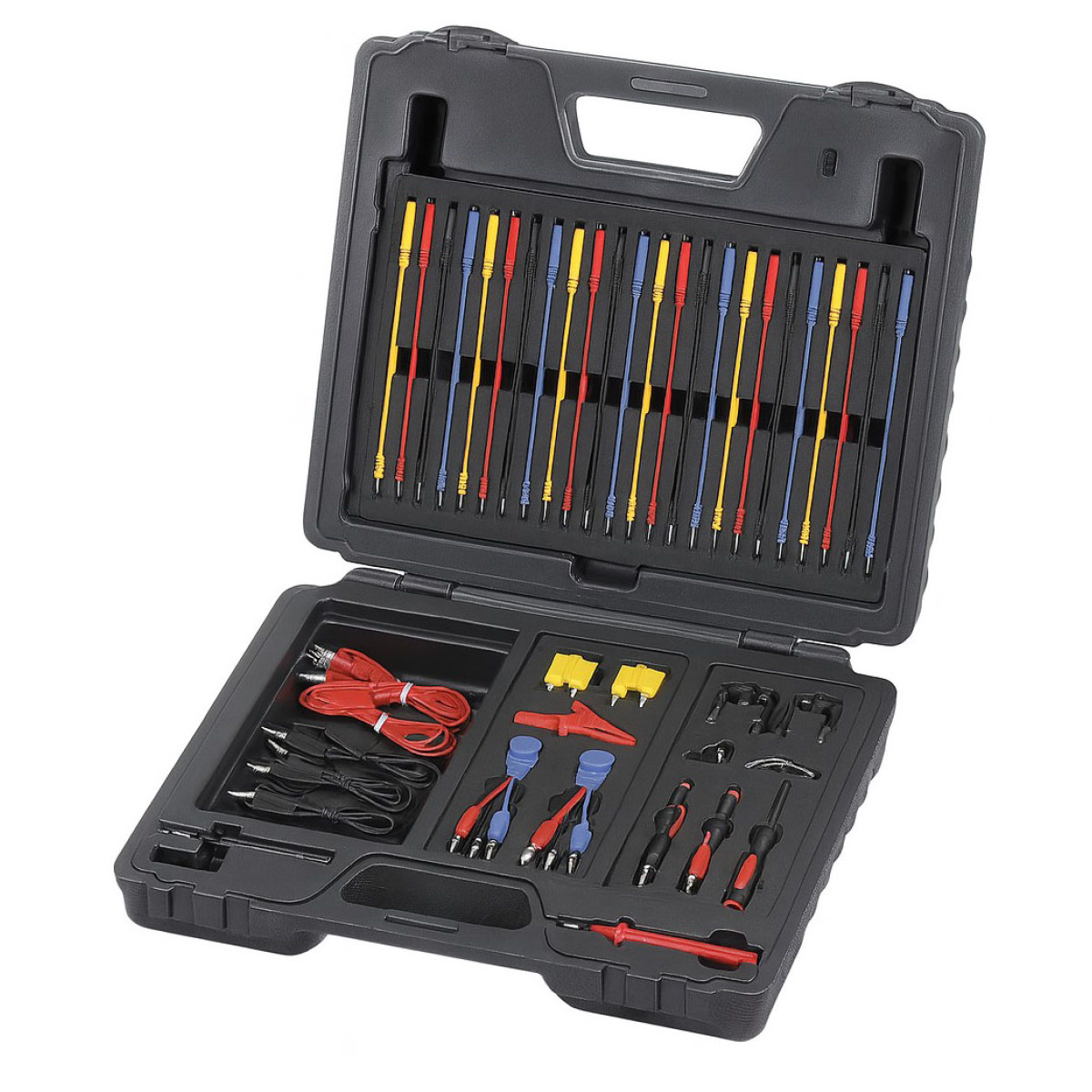 Набор инструмента для авто электриков ASTA A-1150 это универсальный комплект из 92 ед. для тестирования, изоляции и диагностики электрических систем автомобиля. В набор входят различные кабели, штекеры Ø4 мм,разъёмы, клипсы, зонды и адаптеры, позволяющие работать с мультиметром и диагностическим оборудованием без повреждения проводки. Комплект в пластиковом кейсе подходит для большинства американских, европейских иазиатских автомобилей и оптимизирован для сервисных работ и профессиональной диагностики.