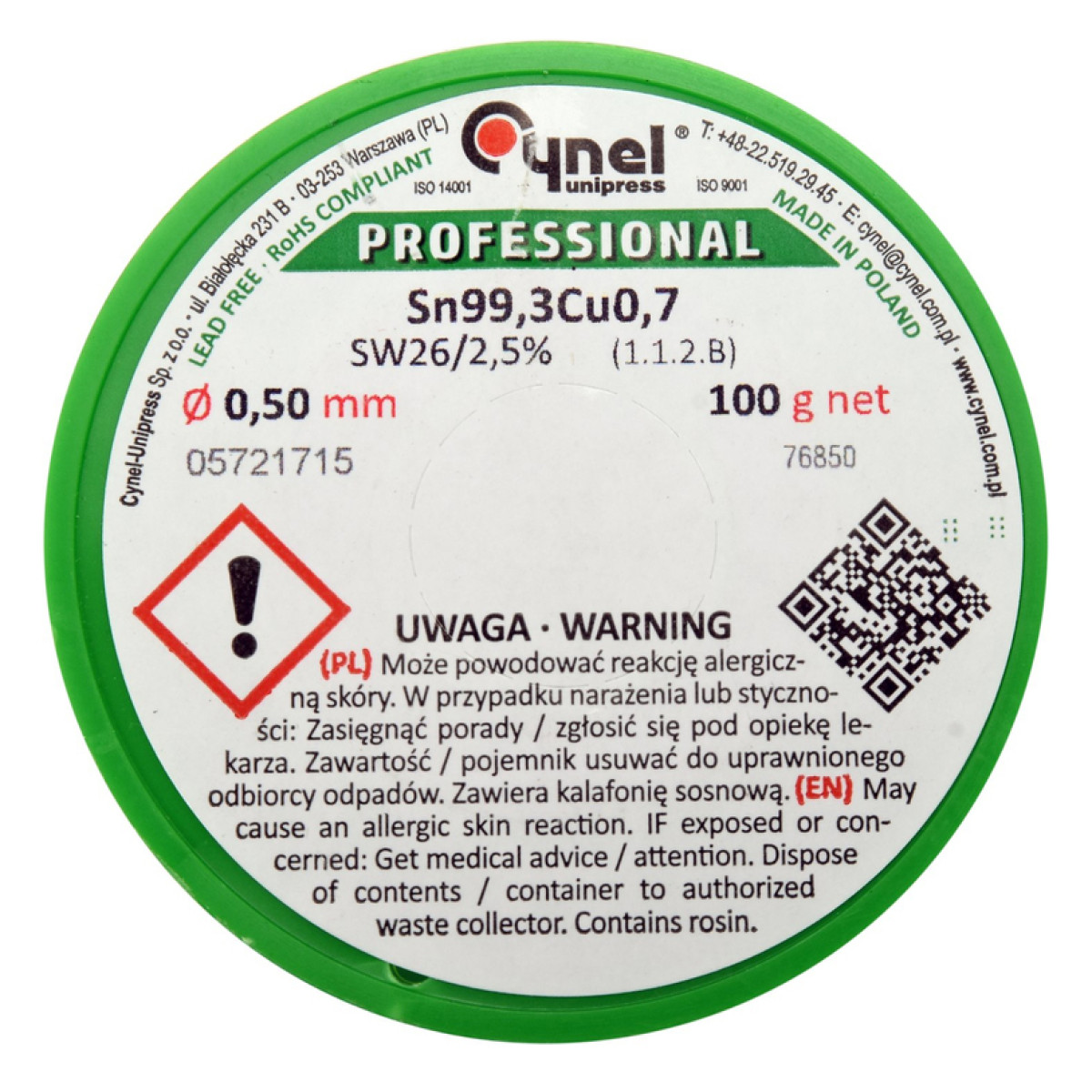 Припой без свинца Sn99,3-Cu0,7,диаметр 0,5мм,100г,паяльная проволока с флюсом. CYNEL 76850 - 76850