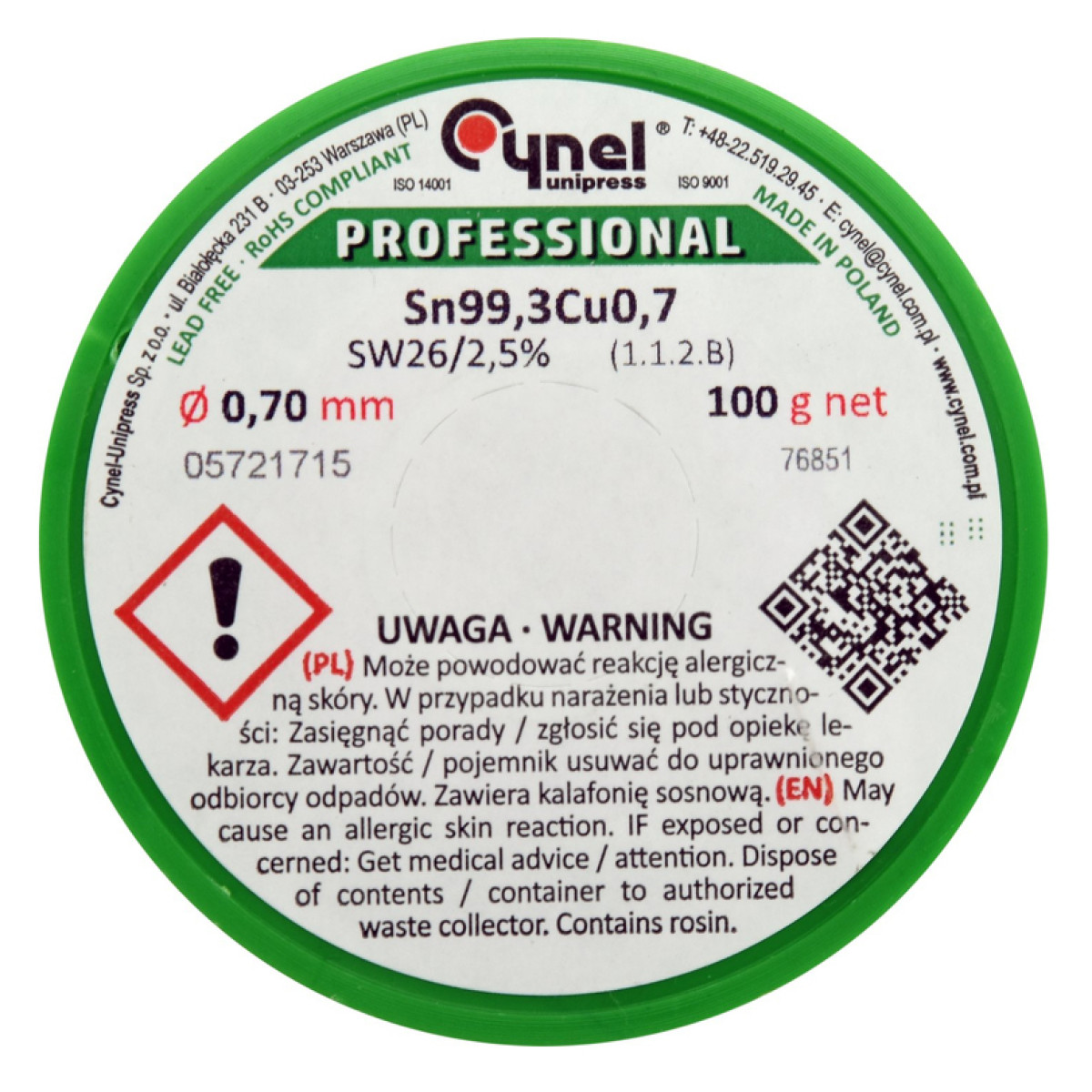 Припой без свинца Sn99,3-Cu0,7,диаметр 0,7мм,100г,паяльная проволока с флюсом. CYNEL 76851 - 76851