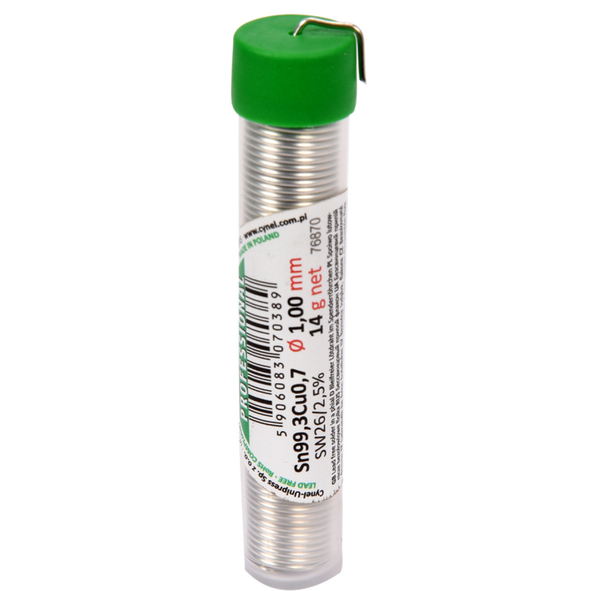 Припой без свинца CYNEL 76870 предназначен для ручной и автоматической пайки электронных компонентов в телекоммуникациях, промышленной электронике, электротехнике и автомобилестроении. Проволочный припой диаметром 1 мм в капсуле с флюсом удобен для дозированной подачи и стабильной работы. Сплав Sn99,3-Cu0,7 обеспечивает надежное соединение, а температура плавления 227°C подходит для технологий бессвинцовой пайки, которые обычно требуют более высоких рабочих температур. Флюс SW26 на основе канифоли с галогенным активатором имеет формулу, которая не требует очистки после пайки и повышает текучесть припоя. Содержание флюса 2,2%, масса капсулы 14 г. Припой соответствует стандарту PN EN 29453:2000 и требованиям RoHS 2002/95/EC, является доступной альтернативой оловянно свинцовым припоям и поддерживает экологические требования по ограничению свинца.