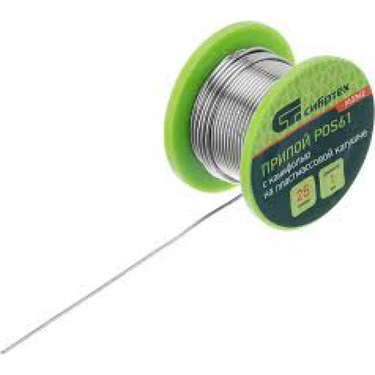 Припой с канифолью марки диаметром массой на пластмассовой катушке предназначен для . Проволока содержит , что и позволяет работать без отдельного нанесения флюса. Марка означает сплав олова и свинца , что обеспечивает стабильное формирование паяного шва. Припой подходит для и других компонентов при помощи паяльника, а намотка на катушку делает использование удобным и аккуратным.