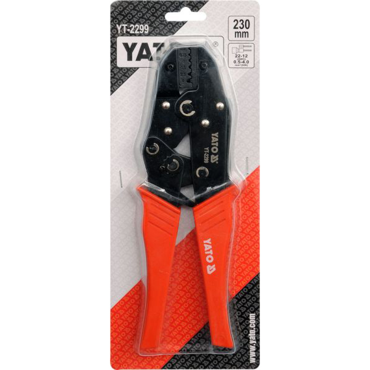 Клещи YATOYT-2299 для зачистки и обжима проводов в диапазоне 0,5–4 мм² (также 22–12 AWG) с длиной 220 мм. Предназначены для электротехнических работ и обеспечивают обжим муфтовых соединителей. Храповый механизм с регулируемой силой зажима позволяет выполнять быстрый и точный обжим без необходимости приложения чрезмерной силы. Почерненная оксидированная поверхность защищает инструмент от коррозии, корпус из углеродистой стали повышает прочность, а рукоятки из ПП обеспечивают комфортный хват. Твердость 44–47 HRC повышает износостойкость рабочей части.