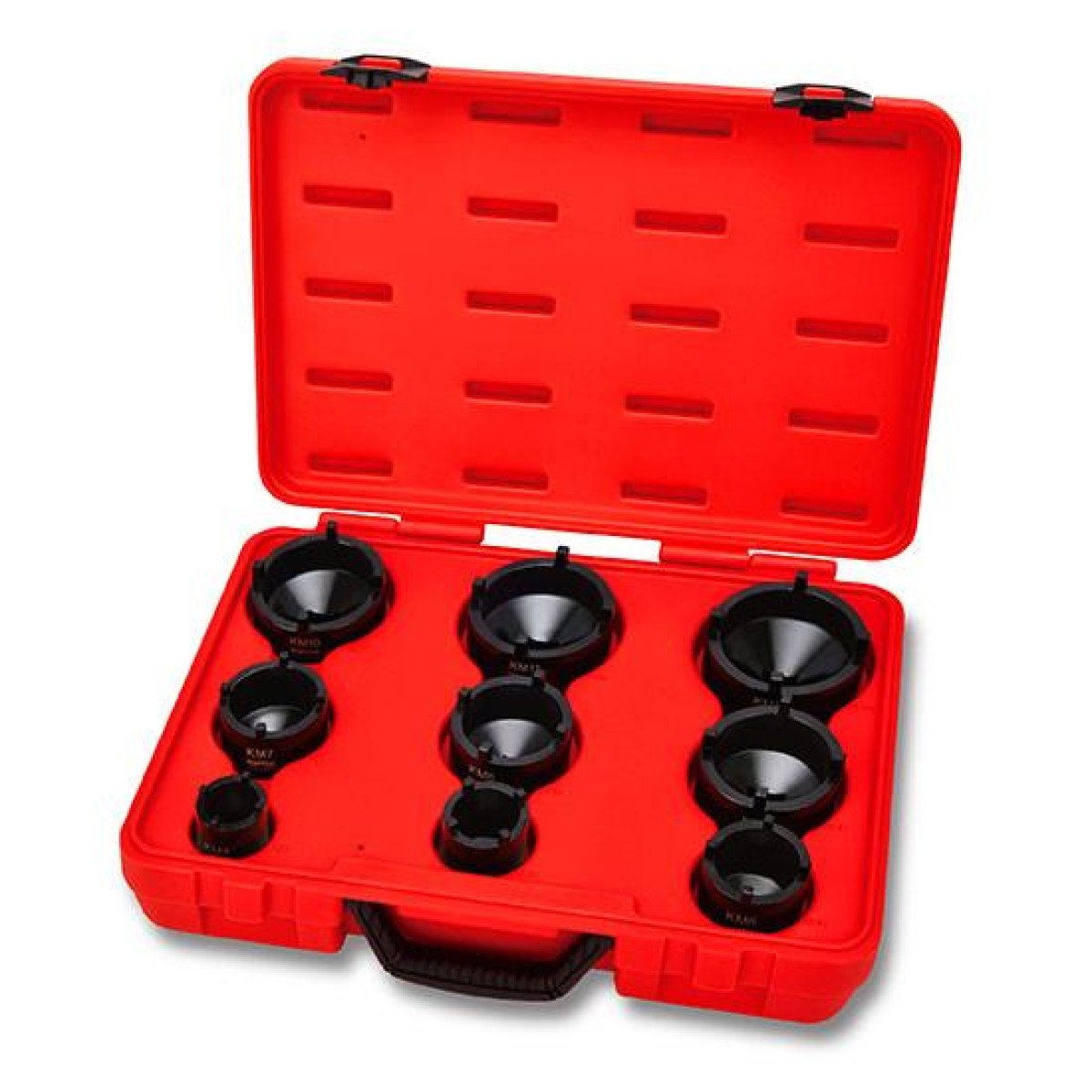 - профессиональный комплект специальных головок для монтажа и демонтажа стопорных гаек типа с наружными зубцами. Набор обеспечивает точную и безопасную работу с подшипниковыми узлами и другими ответственными соединениями.