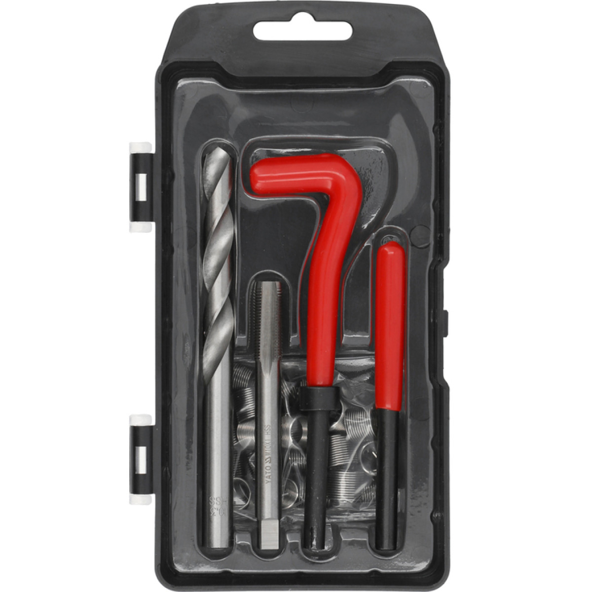 Набор для ремонта резьбы предназначен для точного и надёжного восстановления повреждённых резьбовых соединений типа . Этот комплект обеспечивает эффективное восстановление резьбы в металлических деталях, предотвращая необходимость замены дорогих компонентов.Основные элементы выполнены из высококачественных материалов: из стали , - из , а изготовлены из , что гарантирует долговечность и стойкость к износу.Комплект содержит все необходимые инструменты для подготовки отверстия, нарезания новой резьбы и установки ремонтной вставки, обеспечивая прочное и точное соединение.