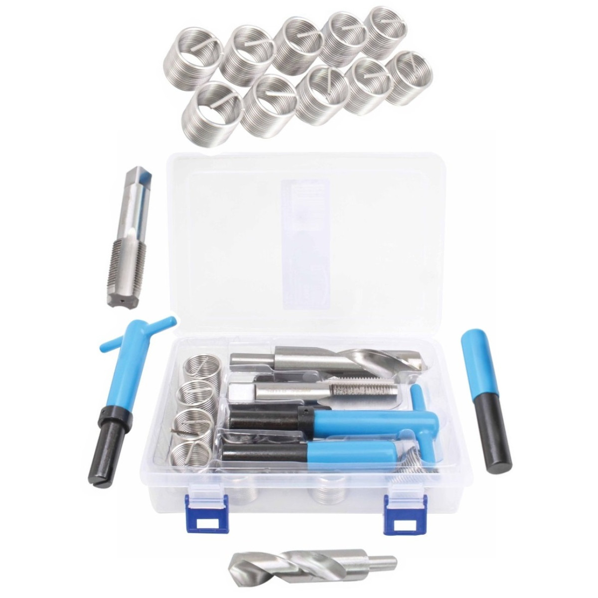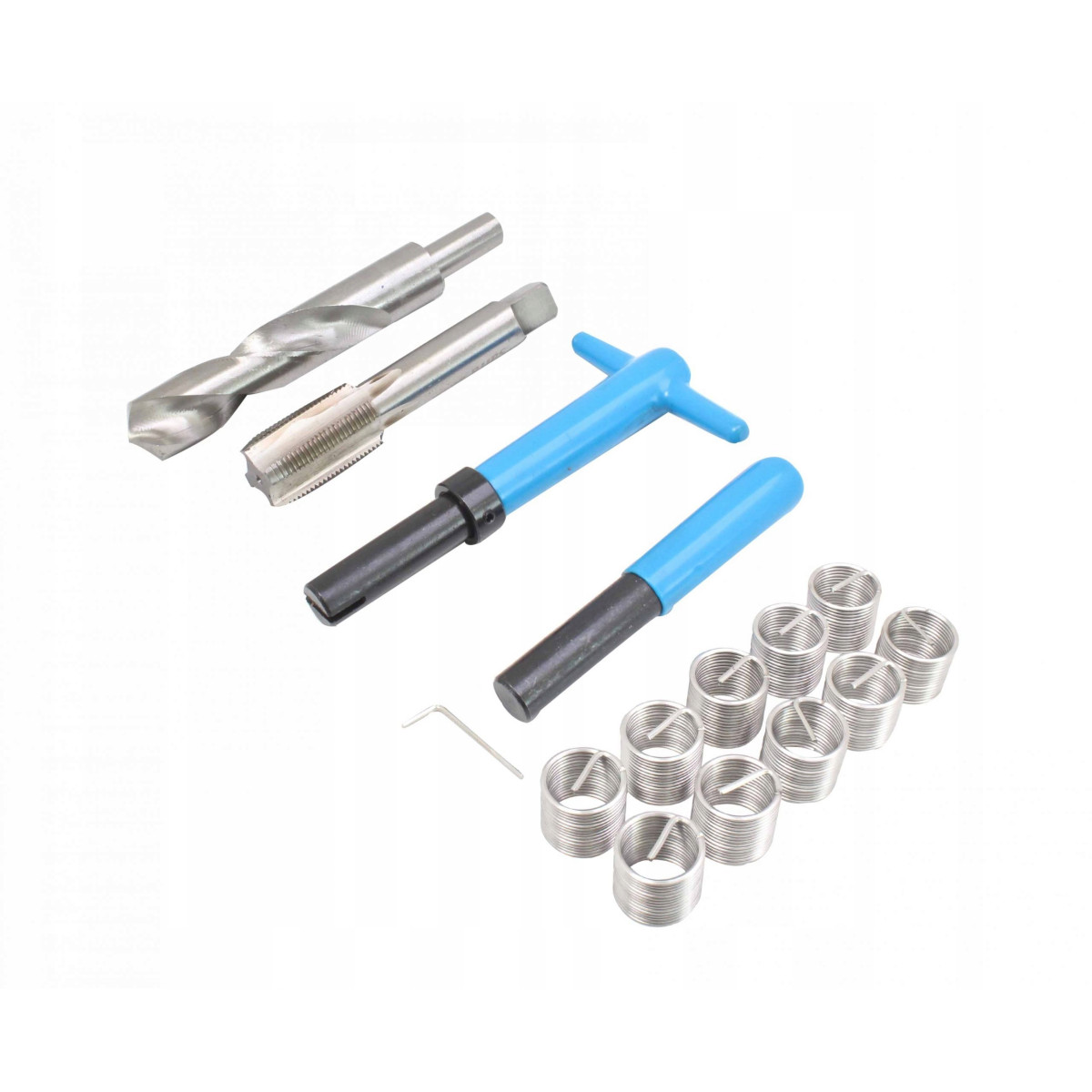 Ремонт выполняется быстро и без снятия головки блока цилиндров. Спиральные вставки из нержавеющей стали восстанавливают резьбу до заводских параметров, обеспечивая прочность и долговечность соединения. Сверло и метчик изготовлены из быстрорежущей стали HSS, что гарантирует точность обработки и длительный срок службы.
