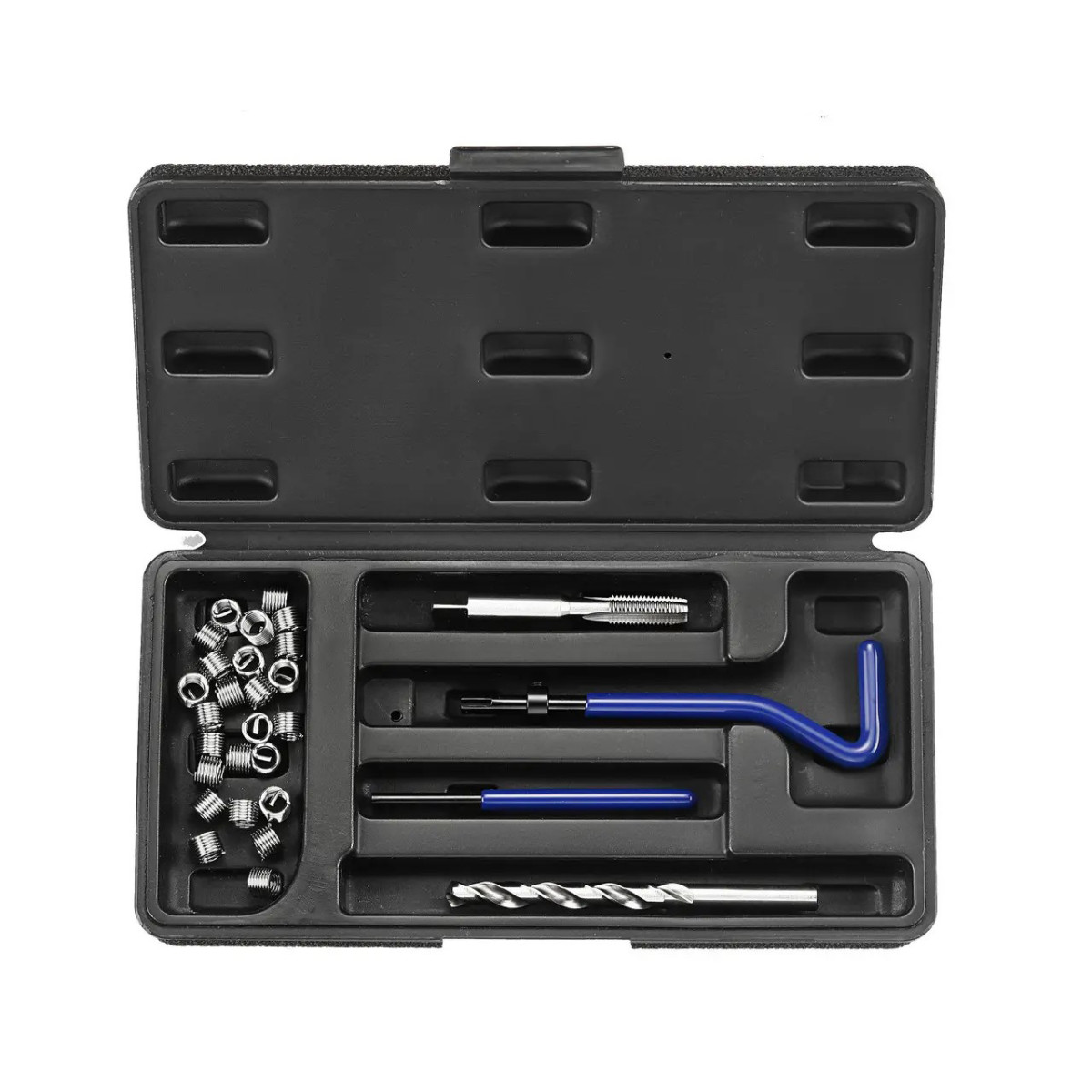 Профессиональный набор предназначен для ремонта и восстановления внутренней резьбы размером . Используется в автосервисах, мастерских и на производстве для быстрого и точного восстановления повреждённых резьбовых соединений. Инструменты изготовлены из высокопрочной стали, что обеспечивает долговечность, точность и надёжность в работе.