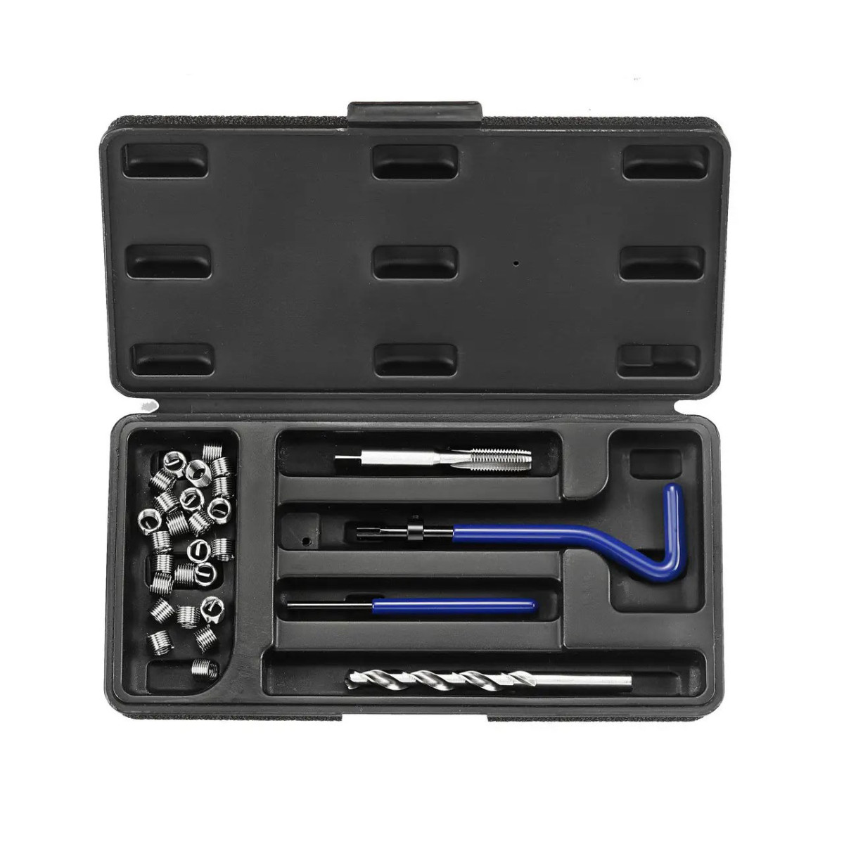 Набор для восстановления резьбы предназначен для типа . Используется для точного восстановления резьбовых соединений в металлических деталях без необходимости их замены. Инструменты изготовлены из , что обеспечивает при работе. Комплект включает , среди которых сверло, метчик, монтажный инструмент и , позволяющих полностью восстановить повреждённую резьбу.