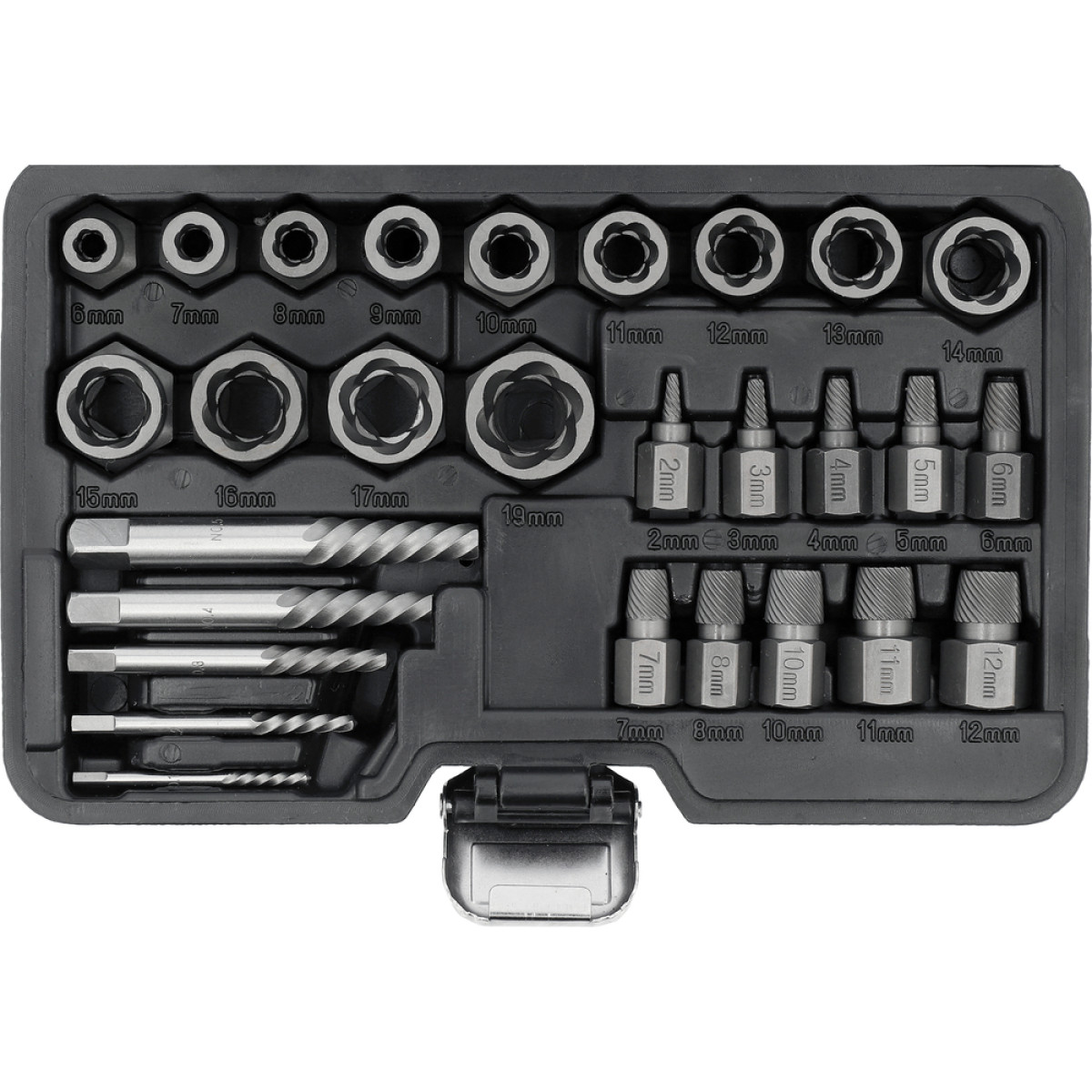 Комплект охватывает широкий диапазон размеров и позволяет работать со стальными и алюминиевыми крепежами с поврежденными гранями или сорванной резьбой.