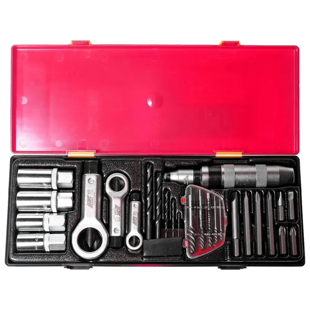 Набор JTC K8261 предназначен для демонтажа крепёжных элементов с повреждённой резьбой при ремонте техники, автомобилей и промышленного оборудования. Инструменты изготовлены из высокопрочных легированных сталей, которые обеспечивают прочность, устойчивость к коррозии и длительный срок службы. Поверхность элементов проходит микрополировку (micro finished), которая эффективно защищает инструмент от царапин, ржавчины и повреждений. Комплект относится к профессиональному и промышленному классу (professional & industrial) и имеет сертификацию ISO 9001, подтверждающую качество и надёжность продукции. Все элементы удобно размещены в прочном пластиковом боксе для транспортировки и хранения.