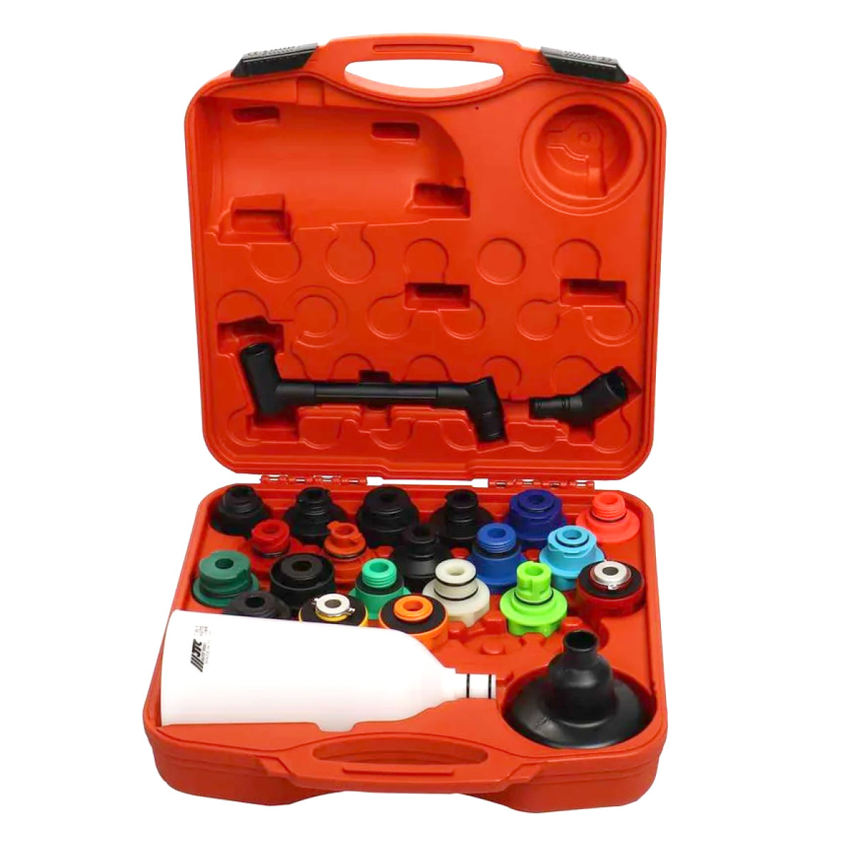 Набор оснащен удобным основанием-воронкой, которое обеспечивает устойчивое размещение и позволяет собирать остатки масла после завершения работ. В комплект входят 20 адаптеров, совместимых с большинством современных автомобилей, что делает набор универсальным решением для СТО и автосервисов.