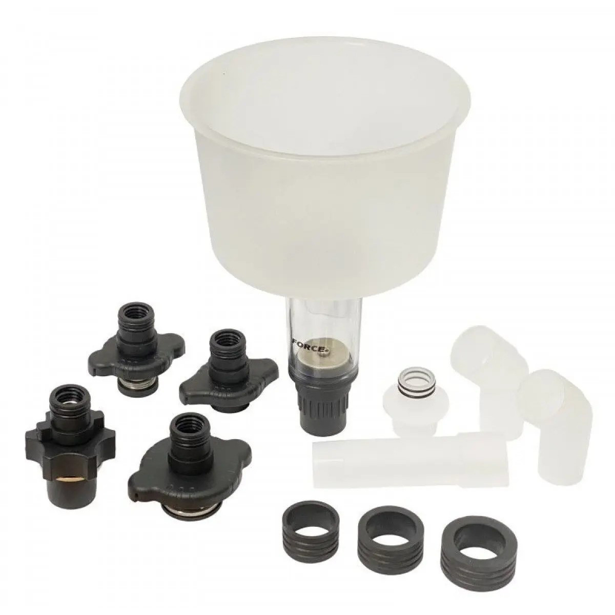 Лейка FORCE 912G17 F предназначена для заправки системы охлаждения и удаления воздушных пробок, предотвращая разлив жидкости и перегрев двигателя. Конструкция обеспечивает герметичное соединение и безопасную работу даже в труднодоступных местах. В комплект входят 4 удлинительные трубки, позволяющие удобно работать в ограниченном пространстве или под сложными углами. Прозрачная нижняя камера помогает контролировать количество пузырьков воздуха, оставшихся в системе, а адаптеры с нейлоновыми крышками уменьшают теплопередачу и риск утечки. Специальная антипроливная конструкция адаптеров гарантирует аккуратную заправку без потерь охлаждающей жидкости.