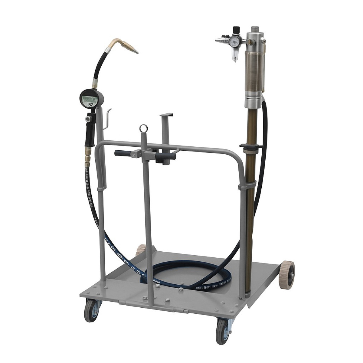 Профессиональная маслораздаточная установка SkyRack SR-306 предназначена для подачи и дозированной раздачи смазочных материалов в бочках объёмом 180-220 кг. Установка оснащена пневматическим насосом, пистолетом раздачи с электронным табло и тележкой для удобного перемещения. Комплектуется маслораздаточным шлангом длиной 4 м, что обеспечивает комфортную работу даже в больших мастерских. Система имеет производительность 15 л/мин, что позволяет быстро и эффективно выполнять заправку технических жидкостей. Оптимальное рабочее давление составляет 3-10 атм, а потребление воздуха при давлении 7 бар-350 л/мин.