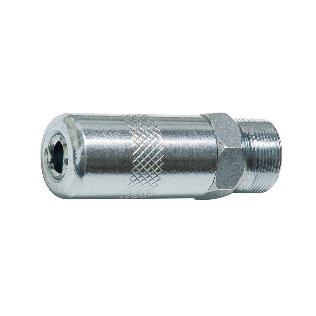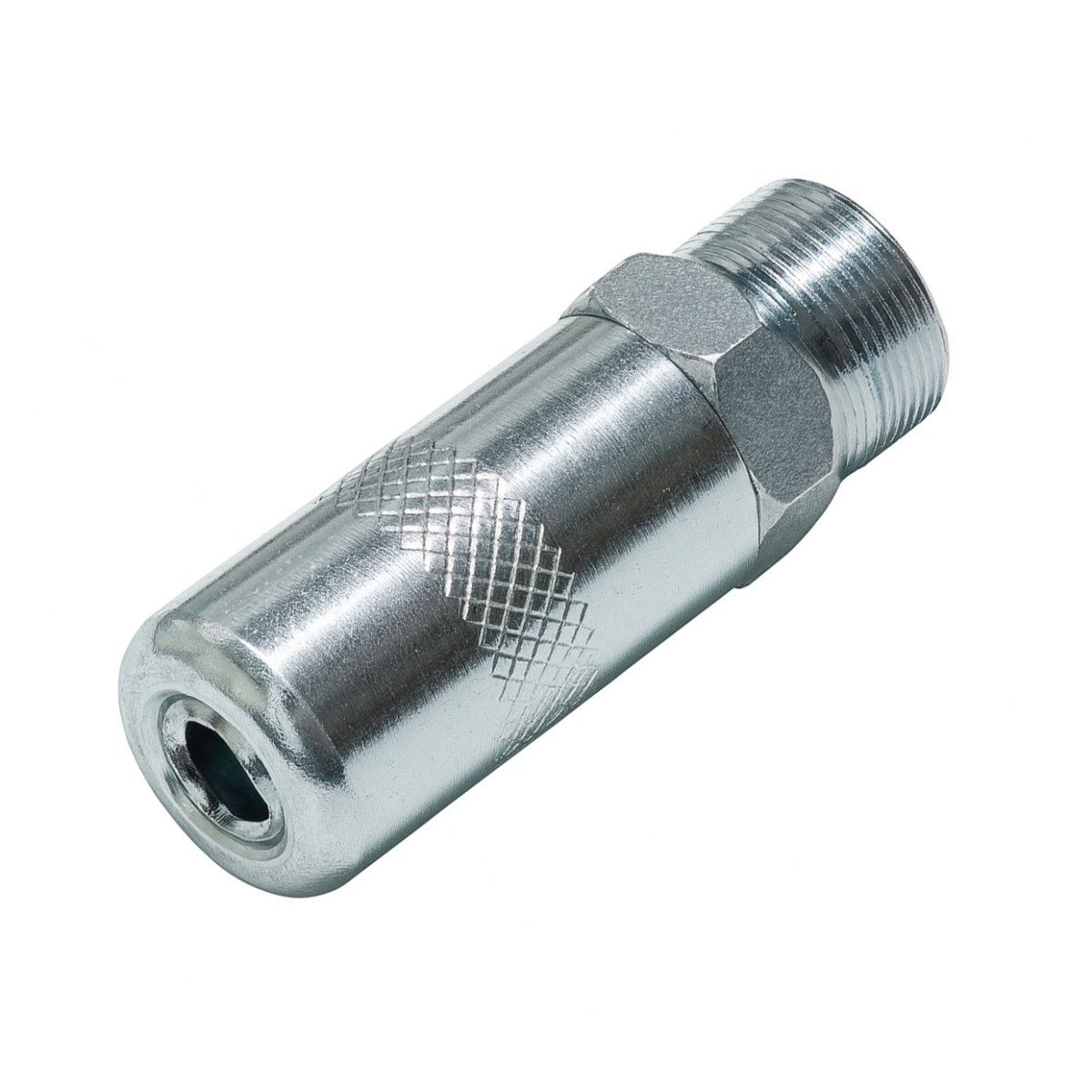 Наконечник шприца оснащён шариковым клапаном и четырёхзажимной конструкцией повышенной прочности. Обеспечивает надёжное фиксирование на пресс-маслёнке и стабильную подачу смазки под давлением. Внутренняя резьба делает наконечник совместимым с большинством шприц-маслёнок. Благодаря усиленной конструкции выдерживает рабочее давление до , обеспечивая долговечность и надёжность при профессиональном использовании.