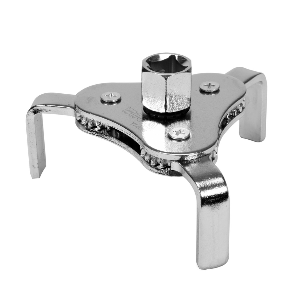 Ключ для снятия масляного фильтратипапредназначен для диаметром . Трёхлапая самозажимная конструкция автоматически подстраивается под размер фильтра и обеспечивает . Инструмент, имеет хромированную полированную поверхность и рассчитан на регулярное использование в автосервисе и гараже. Работает с приводами и .