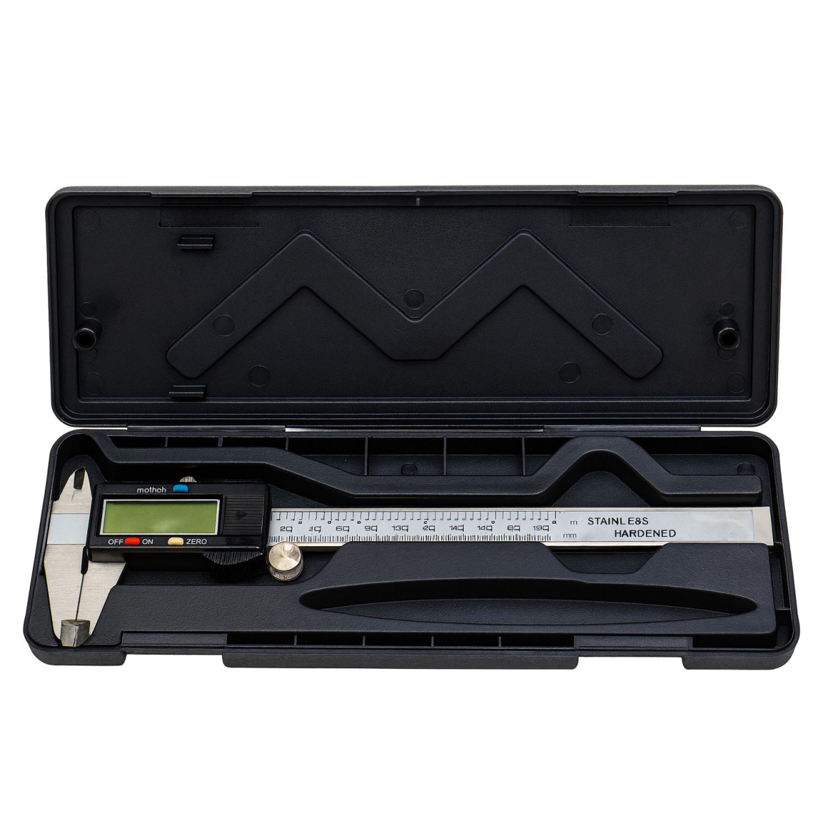 обеспечивает точное измерение внутренних, наружных диаметров и глубины. Инструмент позволяет выполнять измерения как в миллиметрах, так и в дюймах. Оснащён тремя удобными кнопками: красная - включение/выключение, жёлтая - сброс показаний, синяя - выбор единиц измерения (мм/дюйм). Изготовлен из закалённой стали, имеет ЖК-дисплей и питается от батарейки 1,5 В типа LR44.