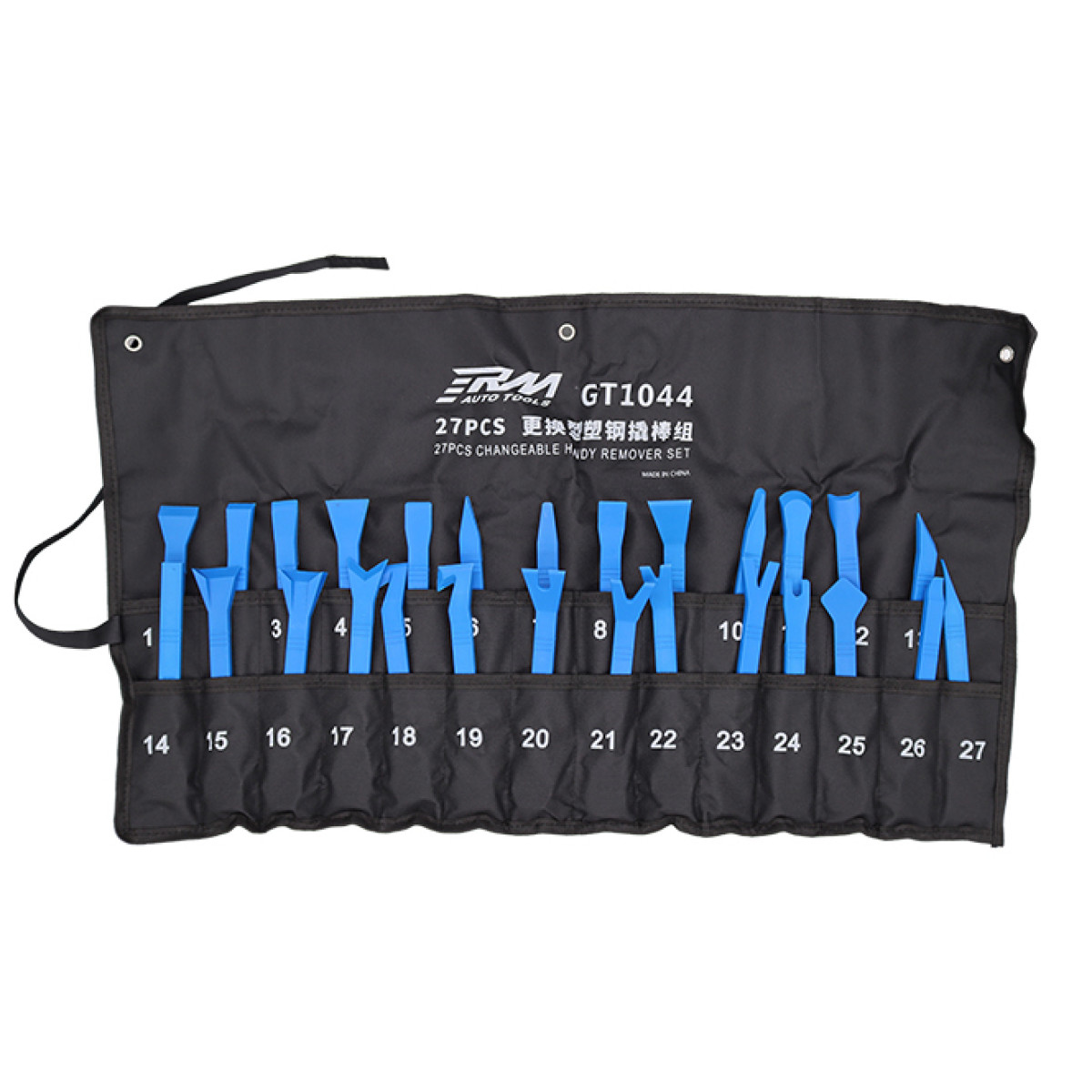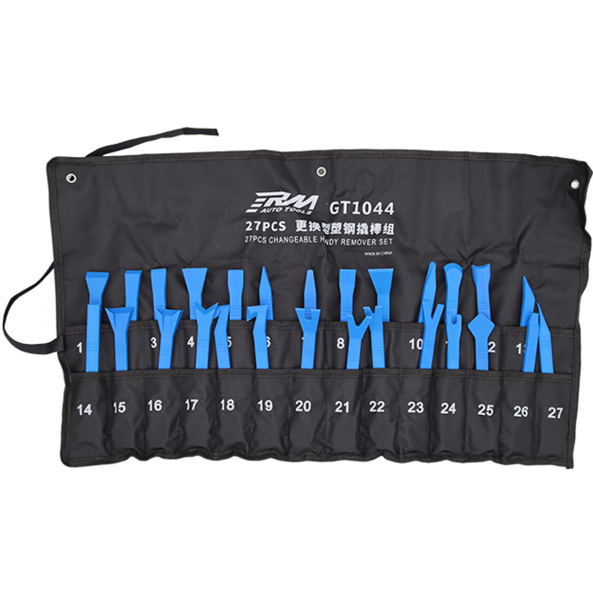 Комплект для демонтажа облицовочных панелей RMGT1044 предназначен для безопасной разборки внутренних панелей автомобиля без повреждения поверхностей. Благодаря особой конструкции съёмников инструмент эффективно используется для снятия клипс и панелей без риска деформации элементов обшивки. Набор состоит из 27 инструментов, которые позволяют выполнять демонтаж и установку обшивки салона аккуратно и контролируемо. В процессе работы достаточно завести инструмент под край дверной панели, вставить крепление и поддеть элемент, что обеспечивает простой и понятный порядок демонтажа. Комплект подходит как для автосервисов, так и для автолюбителей, обеспечивая универсальность и удобство при работе с элементами салона. Во время использования запрещено применять молотки или наносить удары по планкам, так как это может привести к их деформации.