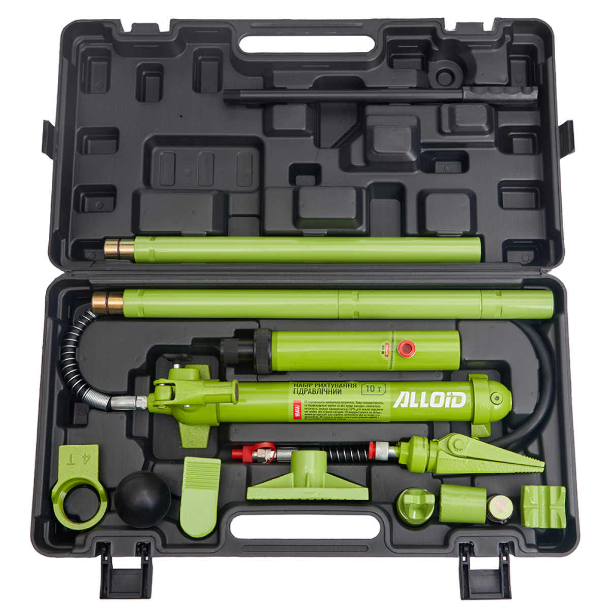 Гидравлический набор Alloid AL-1010A - это профессиональный инструмент для восстановления геометрии кузова автомобиля после повреждений. Усилие в 10 тонн позволяет эффективно выполнять работы по вытяжке, распору и правке металлических элементов, включая стойки, лонжероны и дверные проемы.