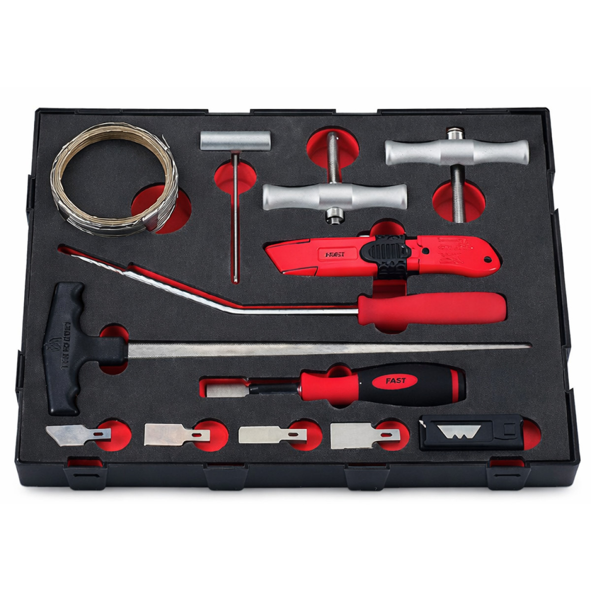 Набор для снятия автомобильных стекол предназначен для . Комплект содержит все необходимые инструменты для выполнения полного цикла работ по вырезке стекла и подготовке автомобиля к кузовному или малярному ремонту. Использование специальной высокопрочной режущей проволоки позволяет , , . Инструменты изготовлены из хромованадиевой стали методом ковки с последующей термообработкой, что . Набор подходит для профессионального использования в автосервисах и гаражных условиях.