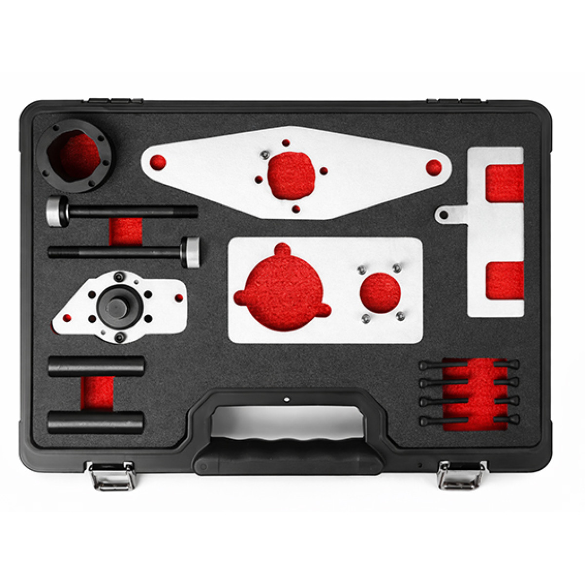 Профессиональный набор фиксаторов VIKTEC VT18190D предназначен для фиксации двигателя в строго заданном положении при обслуживании 2,0-литровых дизельных двигателей JLR серии Ingenium. Комплект используется при снятии и замене цепи ГРМ, а также для проверки и выставления фаз газораспределения.