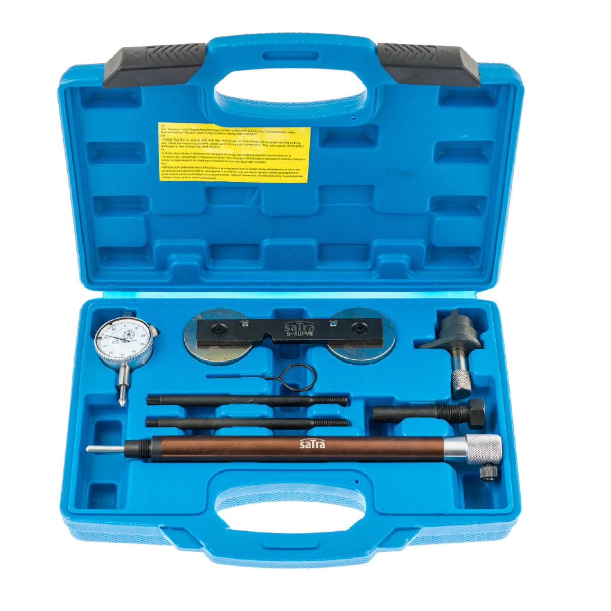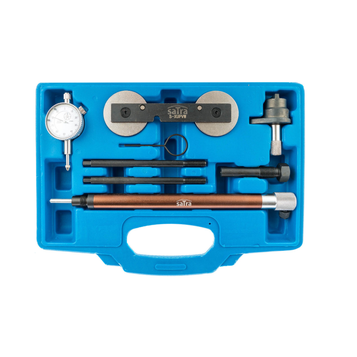 Комплект SATRA S-90010 используется для проверки и регулировки положения коленчатого и распределительного валов при обслуживании двигателей VAG. Применяется при замене ремня или приводной цепи ГРМ, обеспечивает точную установку фаз газораспределения и облегчает сервисные работы.