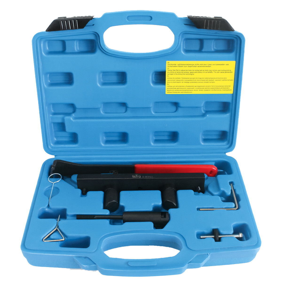 Набор SATRA S-90011 облегчает ремонт и обслуживание двигателей 2.0 FSI/TFSI, позволяет надёжно зафиксировать распредвал и коленвал, что делает работы с ГРМ точными и безопасными.