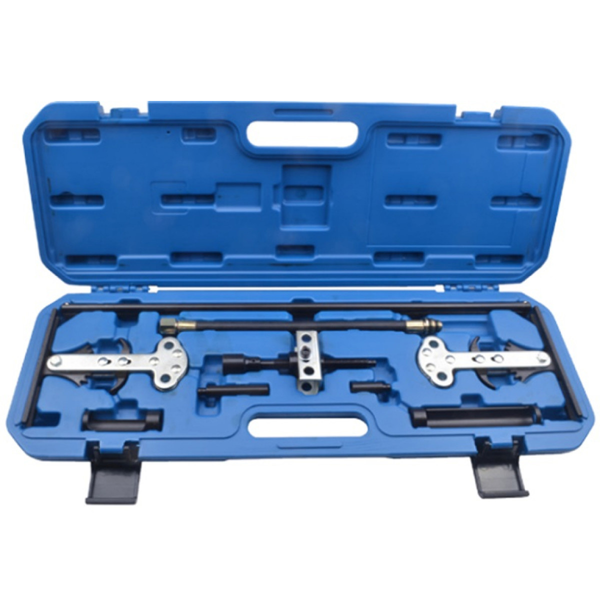 Рассухариватель клапанов для двигателей SOHC DOHC предназначен для демонтажа клапанных пружин, стержней клапанов и сальников без снятия головки блока цилиндров. Инструмент широко используется в автосервисах и на СТО, обеспечивая быстрое и эффективное выполнение работ. Благодаря использованию адаптера сжатого воздуха клапан удерживается под давлением в камере сгорания, что повышает безопасность и удобство работы. Конструкция с поворотной системой и направляющими позволяет быстро устанавливать инструмент и работать с различными типами двигателей.