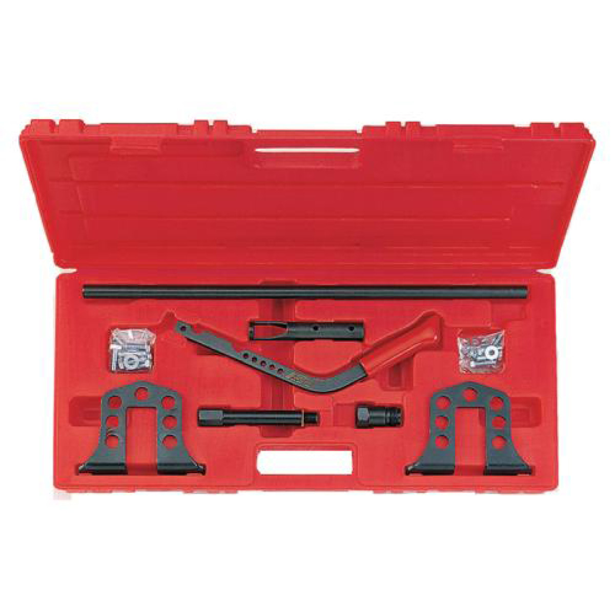 Рассухариватель клапанов универсальный предназначен для сжатия и установки клапанных пружин как на установленной, так и на снятой головке блока цилиндров. Инструмент подходит для бензиновых и дизельных двигателей и обеспечивает удобную и эффективную работу. Оснащен регулируемым основанием с многоточечным креплением и рычажным механизмом, что позволяет быстро и безопасно выполнять обслуживание клапанного механизма. Конструкция обеспечивает удобный доступ к клапанам даже в труднодоступных местах.