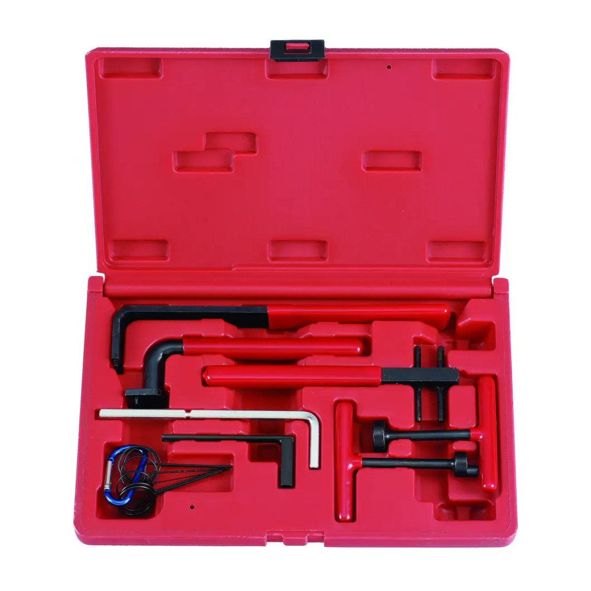 Набор ключей для натяжения ремней ГРМ предназначен для профессионального обслуживания систем газораспределительного механизма. Комплект включает необходимые инструменты для замены ремня привода распределительного вала и работы с различными типами натяжных механизмов. Подходит для большинства бензиновых и дизельных двигателей, обеспечивая удобство работы даже в сложных условиях.