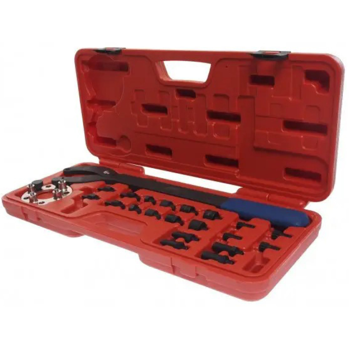 Фиксатор шкива распредвала VAG 1.0L, 1.2L, 1.4L EA211, 2.0L FSI, TSI предназначен для фиксации шкивов, звездочек и валов двигателей группы VAG при выполнении ремонтных работ. Комплект включает рукоятку-держатель и набор адаптеров и штифтов, которые обеспечивают надежное удержание шкивов, фланцев распределительных валов и болтов шкива коленчатого вала. Инструмент позволяет точно выполнять работы по обслуживанию ГРМ, демонтажу и установке узлов двигателя.