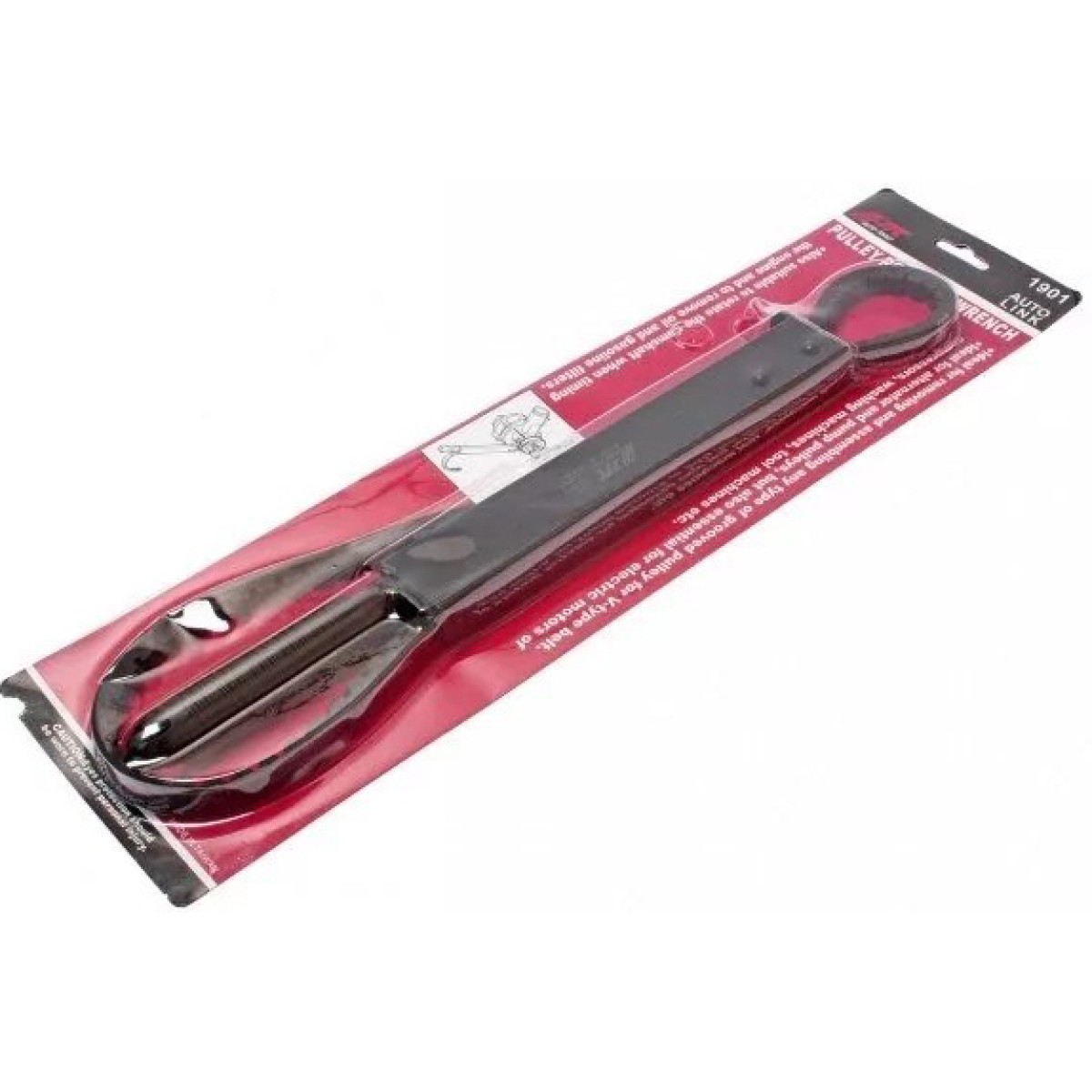 Фиксатор шкива универсальный с поперечными ребрами предназначен для удержания различных шкивов при выполнении ремонтных работ. Инструмент подходит для работы с генераторами, насосами, электродвигателями и другими механизмами, а также может использоваться для проворачивания распределительного вала при выставлении зажигания или замене фильтров. Прочная конструкция обеспечивает надежную фиксацию и эффективность при работе.