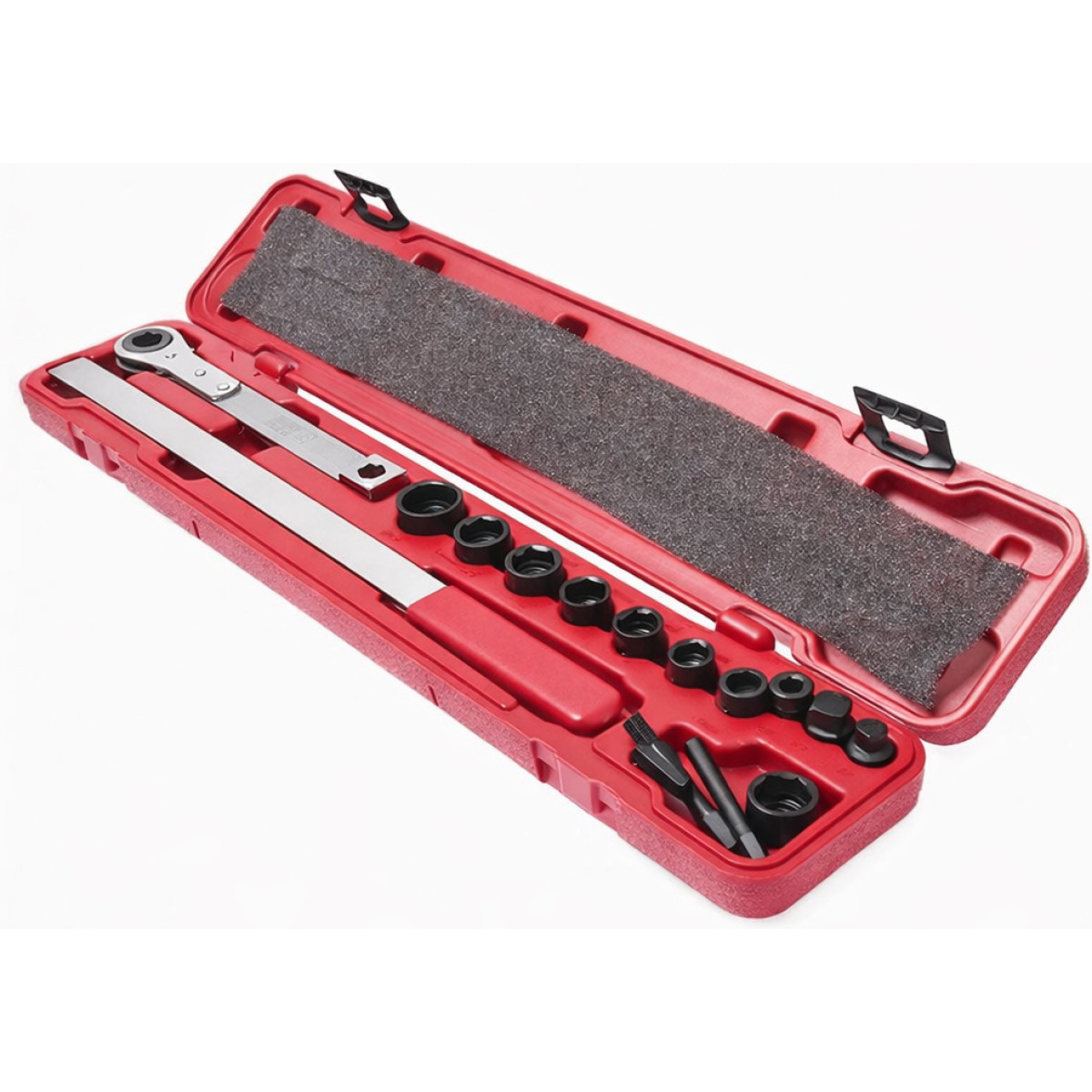 Комплект сервисных инструментов для поликлинового ремня универсальный предназначен для натяжения и обслуживания ремней привода вспомогательных агрегатов. Набор позволяет эффективно выполнять работы с генератором, кондиционером и другими узлами. Инструменты обеспечивают удобную работу даже в ограниченном подкапотном пространстве и подходят для большинства автомобилей с поликлиновыми ремнями. Поставляется в прочном кейсе для удобного хранения и транспортировки.