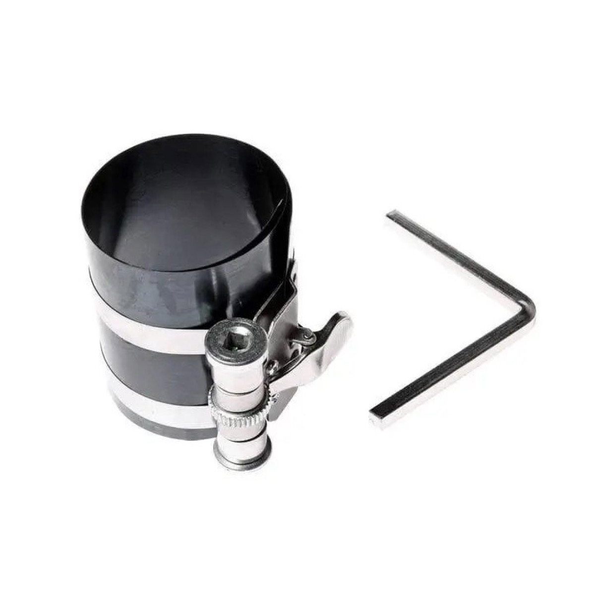 Оправка поршневых колец ⌀53–125 мм, H 75 мм предназначена для сжатия поршневых колец при установке поршней в цилиндры двигателя. Инструмент значительно упрощает процесс монтажа благодаря автоматической фиксации, что обеспечивает надежное удержание колец во время работы. Изготовлен из высококачественной пружинной стали, что гарантирует долговечность и надежность при эксплуатации.