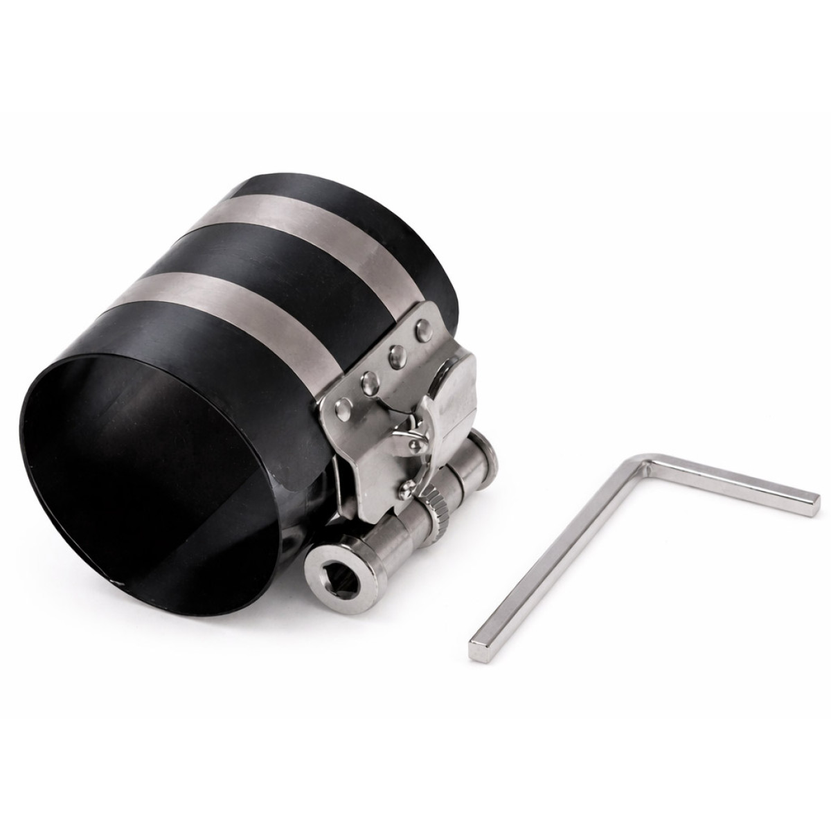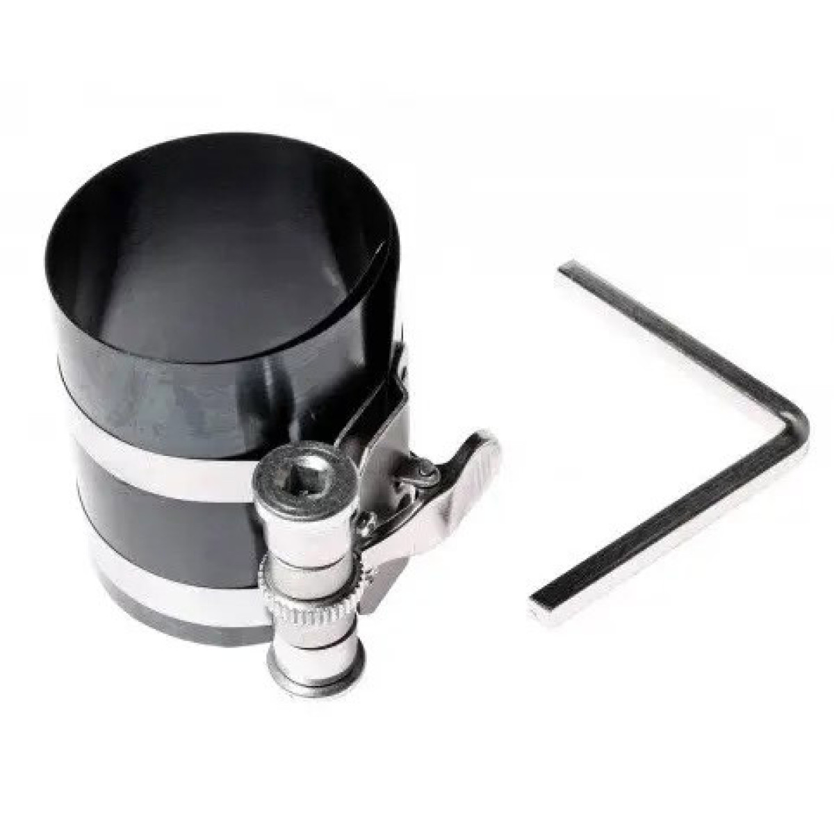 Оправка поршневых колец ⌀90–175 мм, H 75 мм предназначена для сжатия поршневых колец при установке поршней в цилиндры двигателя. Инструмент значительно облегчает процесс монтажа благодаря автоматической фиксации, что обеспечивает надежное удержание колец во время работы. Изготовлен из специальной пружинной стали, что гарантирует долговечность и надежность при эксплуатации.