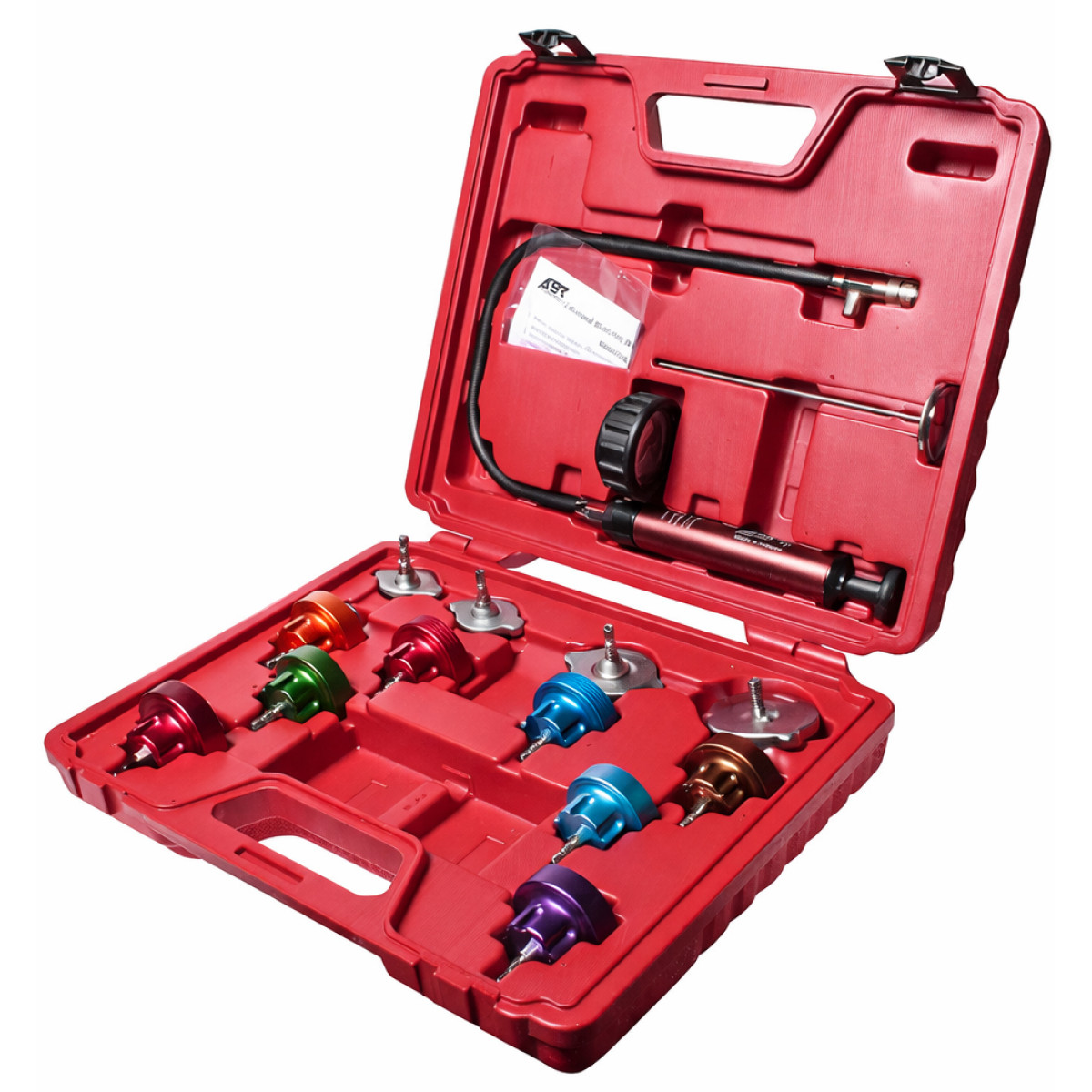 Набор предназначен для проверки герметичности системы охлаждения автомобиля и выявления утечек охлаждающей жидкости. Проверка выполняется путем создания контролируемого давления в системе с помощью ручного насоса с манометром. Комплект оснащен поворотными крышками для различных типов горловин радиаторов, что позволяет использовать инструмент для большого количества автомобилей. Набор подходит для профессионального использования на станциях технического обслуживания и в автомастерских.