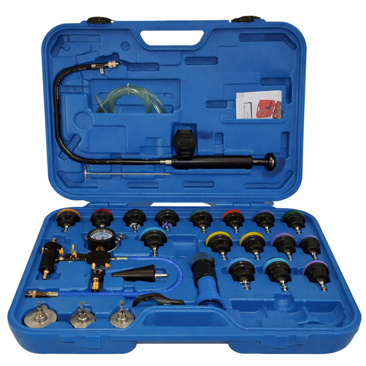 Прибор предназначен для проверки герметичности радиатора и всей системы охлаждения автомобиля, а также для быстрой замены охлаждающей жидкости. Проверка выполняется путем создания контролируемого давления в системе с помощью ручного насоса с манометром. Это позволяет быстро выявить утечки в радиаторе, патрубках и соединениях системы охлаждения. Цветовая маркировка крышек позволяет легко подобрать подходящий адаптер для конкретного автомобиля. Набор подходит для большинства европейских, японских и американских автомобилей и широко используется на станциях технического обслуживания.