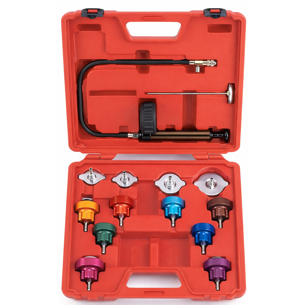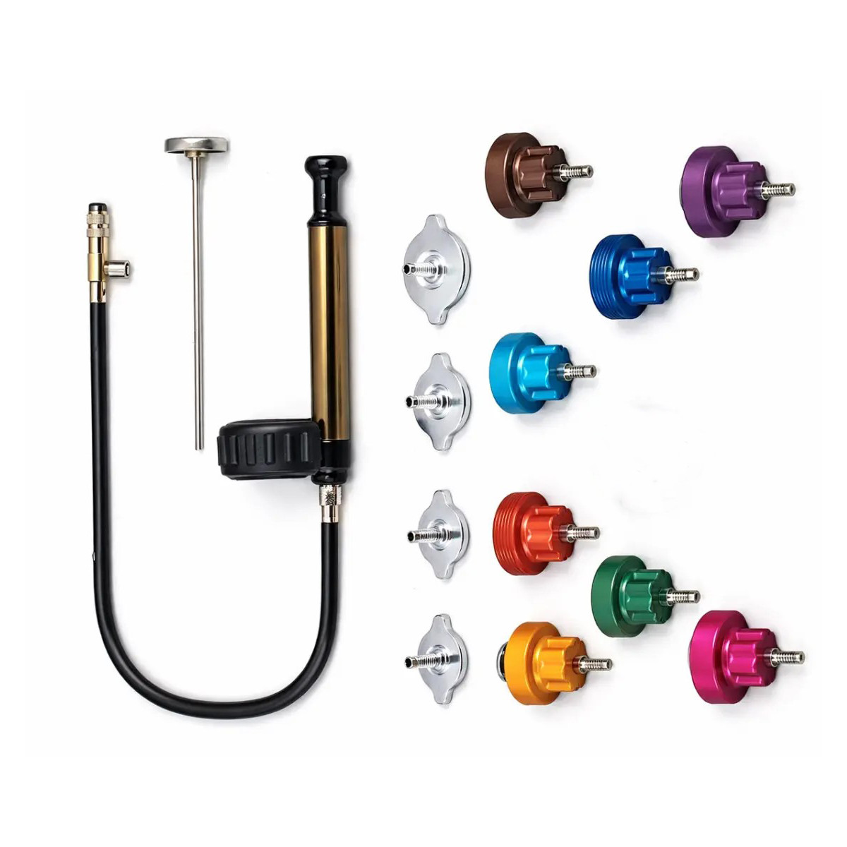 Набор предназначен для проверки герметичности системы охлаждения двигателя. Инструмент позволяет быстро обнаружить утечки в радиаторе, патрубках и соединениях системы охлаждения путем создания избыточного давления с помощью ручного насоса с манометром. После создания давления контролируются показания манометра: если они уменьшаются, это указывает на наличие утечки в системе. Набор подходит для проверки систем охлаждения бензиновых и дизельных двигателей легковых и грузовых автомобилей. Адаптеры изготовлены из анодированного алюминия, а металлический цилиндр насоса обеспечивает высокую износостойкость и долговечность инструмента.