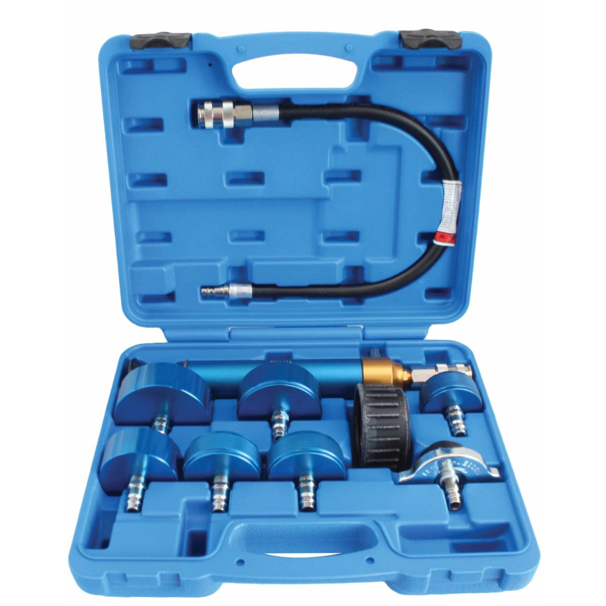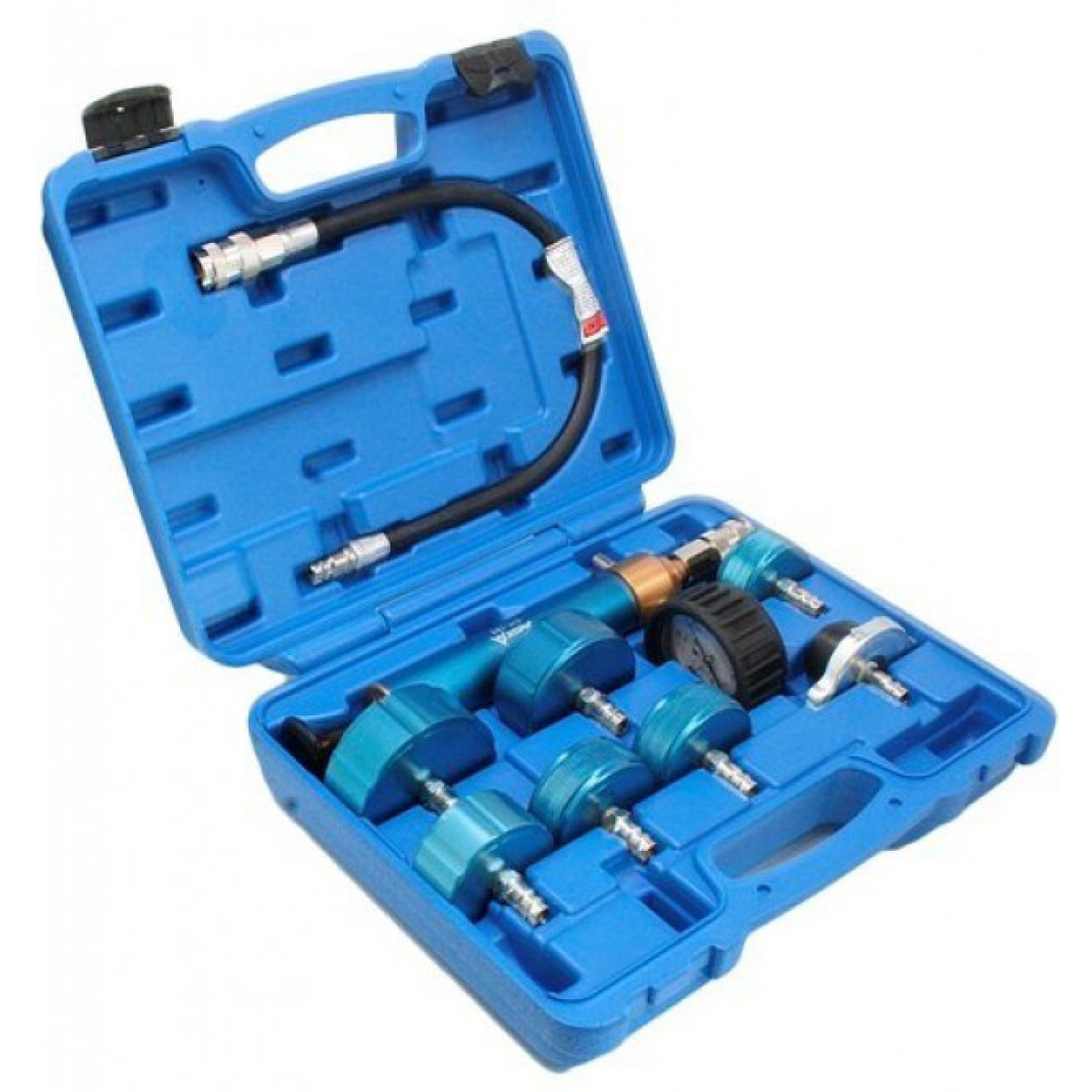 Профессиональный диагностический набор предназначен для проверки герметичности системы охлаждения в грузовых автомобилях. Инструмент используется для обнаружения утечек в радиаторах, патрубках и соединениях системы охлаждения путем создания контролируемого избыточного давления. Прибор оснащен ручным насосом с манометром и комплектом адаптеров, что позволяет работать с различными типами горловин радиаторов и расширительных бачков. Набор широко применяется при обслуживании коммерческого транспорта и тяжелой техники.