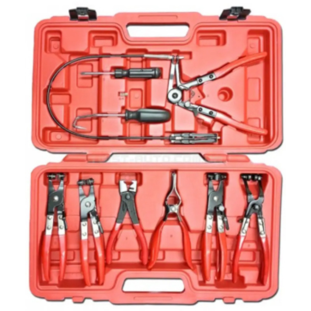 Набор клещей и зажимов для хомутов и патрубков предназначен для ослабления и затяжки хомутов. Инструменты подходят для работы с топливными водяными и масляными системами. Обеспечивают эффективный демонтаж и монтаж хомутов различных типов. Подходят для большинства европейских американских и азиатских автомобилей. Позволяют работать в труднодоступных местах. Оснащены тросовым механизмом длиной 630 мм для удобства работы. Изготовлены из прочных материалов что обеспечивает долговечность.