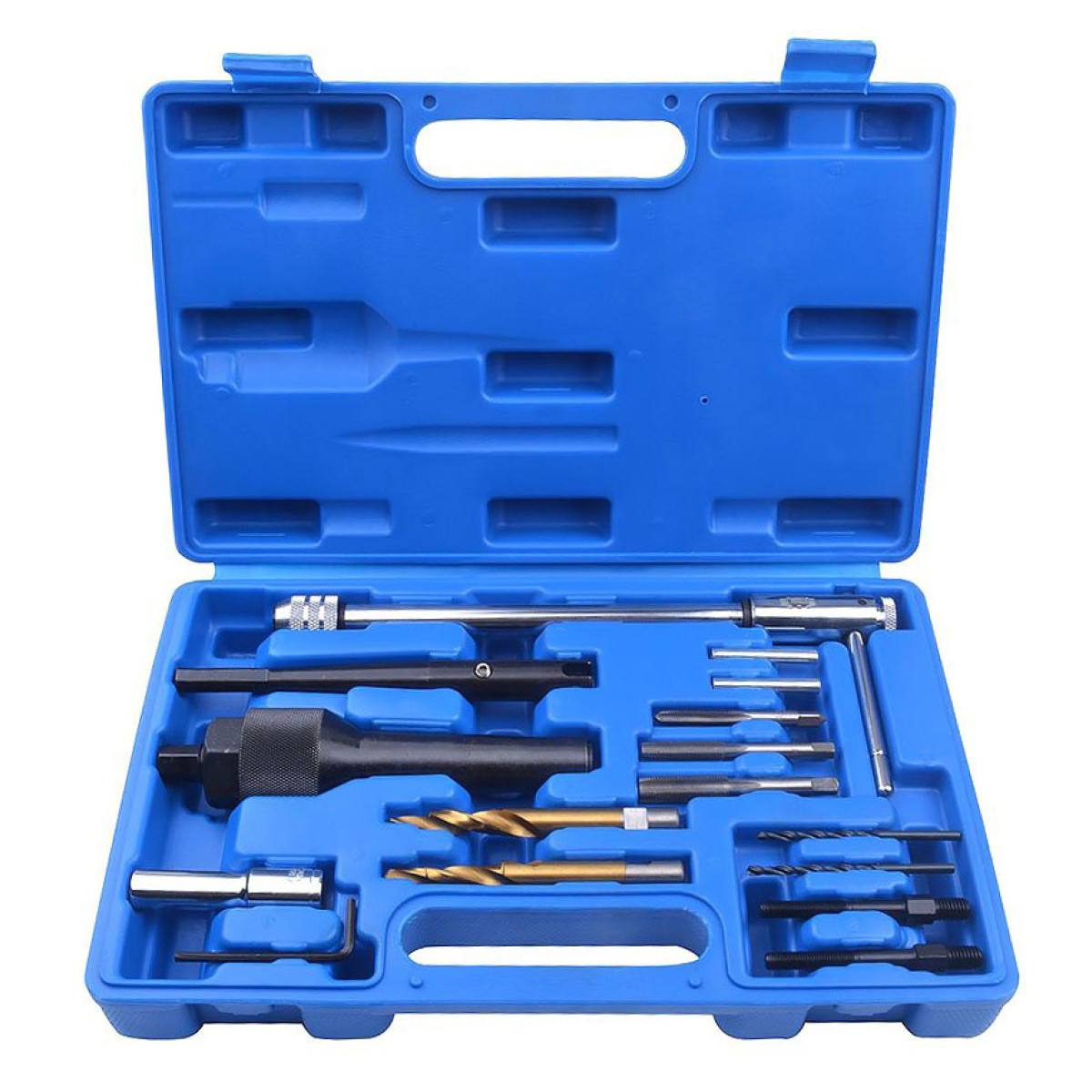 Наборпредназначен для с резьбой и без демонтажа головки блока цилиндров. Позволяет выполнять ремонт даже в случаях, когда свеча обломана заподлицо с поверхностью ГБЦ. Продуманная конструкция обеспечивает точное центрирование и минимизирует риск повреждения посадочного места. Использование пневматического адаптера позволяет работать , предотвращая попадание стружки в камеру сгорания и сохраняя резьбу.