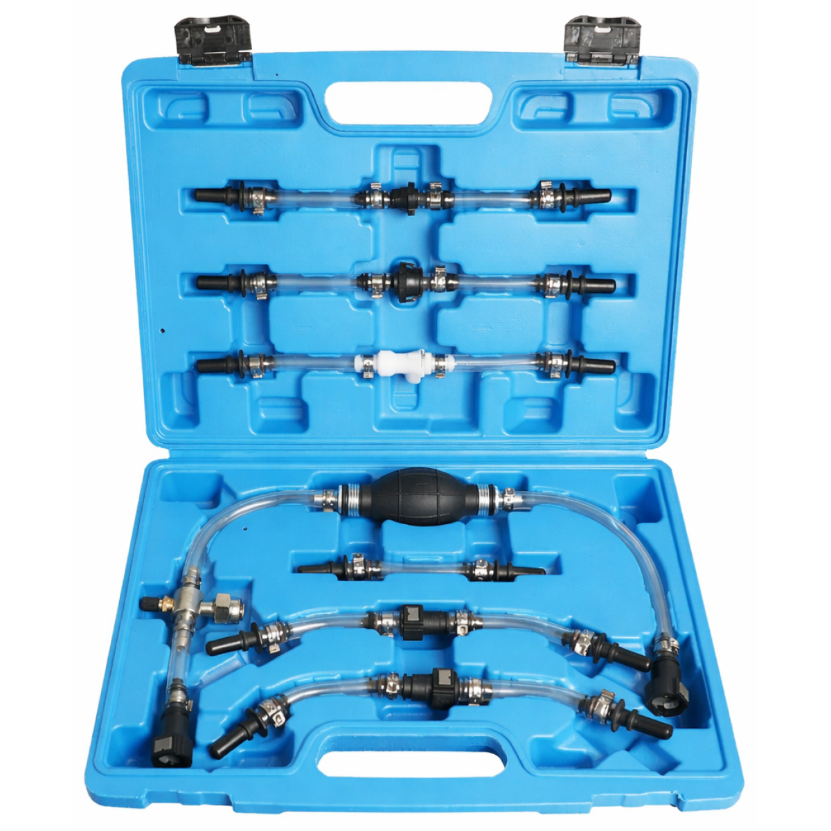 Комплект для подкачки и прокачки дизельного топлива из 7 предметов предназначен для прокачки стороны низкого давления в дизельных топливных системах. Необходим при замене дизельных фильтров, топливных насосов или других компонентов системы впрыска дизельного топлива. Предотвращает дефекты насосов высокого давления (CDI), которые часто возникают при замене фильтров без ручной заправки системы. В комплект входят 6 различных переходных шлангов и ручной насос с клапаном. Подходит для автомобилей марок Ford, PSA, Opel, Fiat, Rover, Land Rover, Renault, Mercedes-Benz.