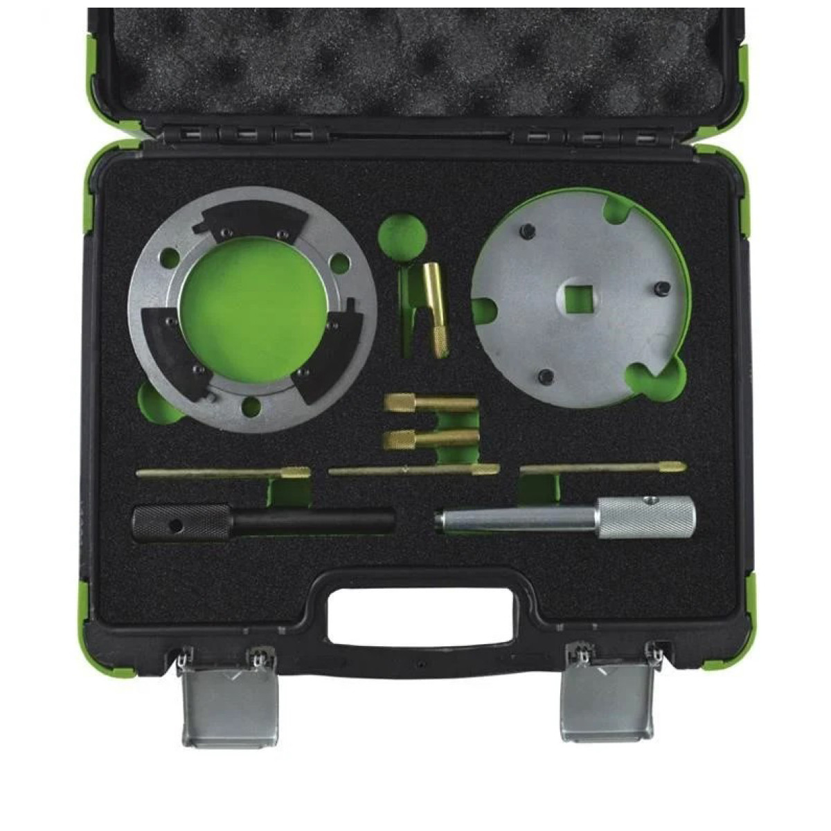 Набор инструментов для установки и регулировки топливного насоса предназначен для фиксации коленчатого вала, распределительного вала, шестерни ТНВД и натяжителя ремня при обслуживании дизельных двигателей. Инструмент используется при установке и регулировке топливного насоса на двигателях Ford. Набор специальных инструментов обеспечивает точную фиксацию элементов газораспределительного механизма и топливной системы при проведении ремонтных работ и регулировке момента впрыска.