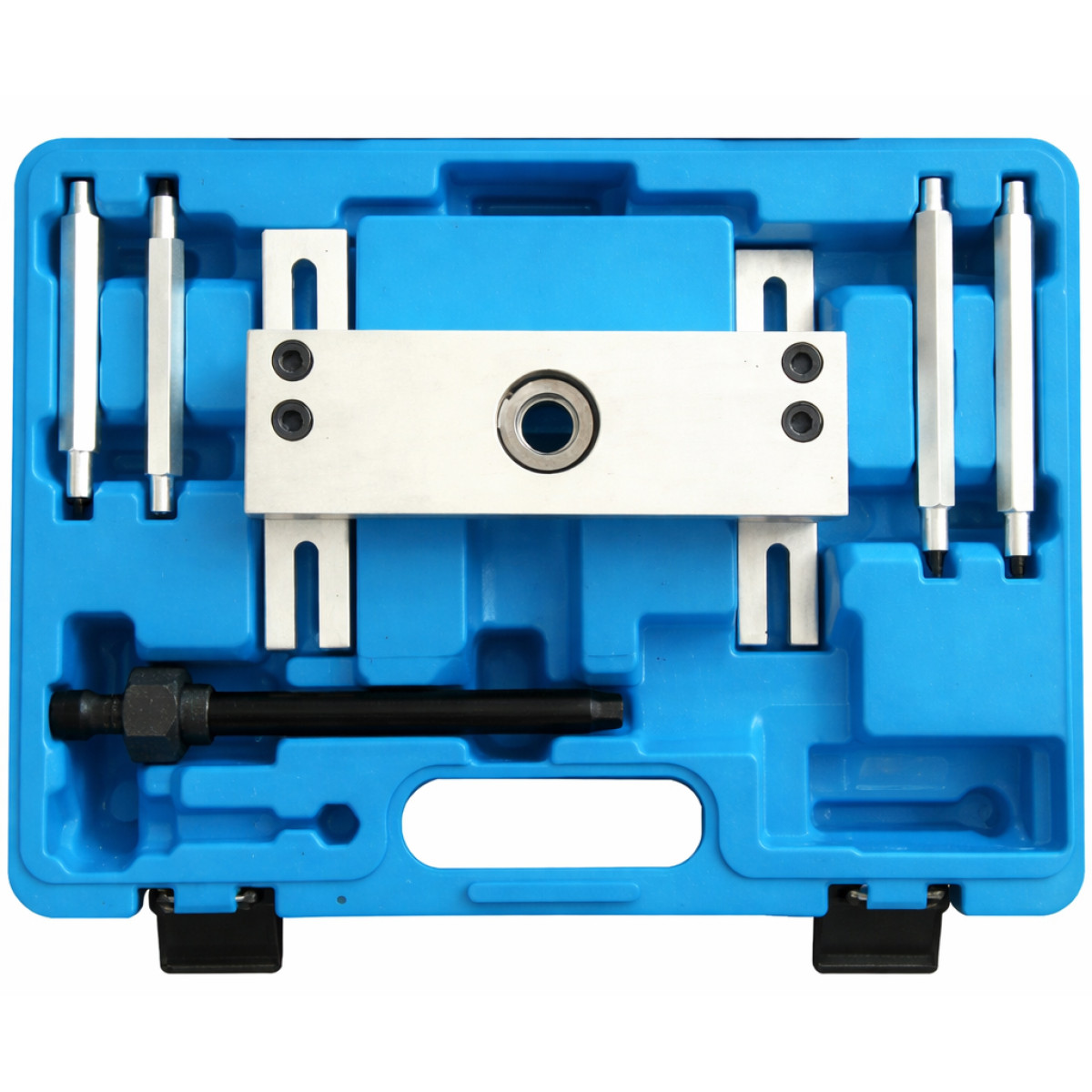 Комплект для снятия форсунок предназначен для демонтажа плотно посаженных дизельных форсунок системы Common Rail в двигателях BMW без необходимости снятия головки блока двигателя. Инструмент используется для ремонта и обслуживания дизельных двигателей BMW с системой впрыска Common Rail. Подходит для модификаций двигателей M47TU, M57, M57TU, M87, M87TU. Перед демонтажем форсунки необходимо снять электромагнит и гайку крепления клапана мультипликатора. После этого ввернуть подходящий шпиндель и установить опорную часть на головку блока двигателя, используя соответствующие удлинители и стойки. Далее демонтаж инжектора выполняется с использованием опорного подшипника с гайкой для шпинделя.