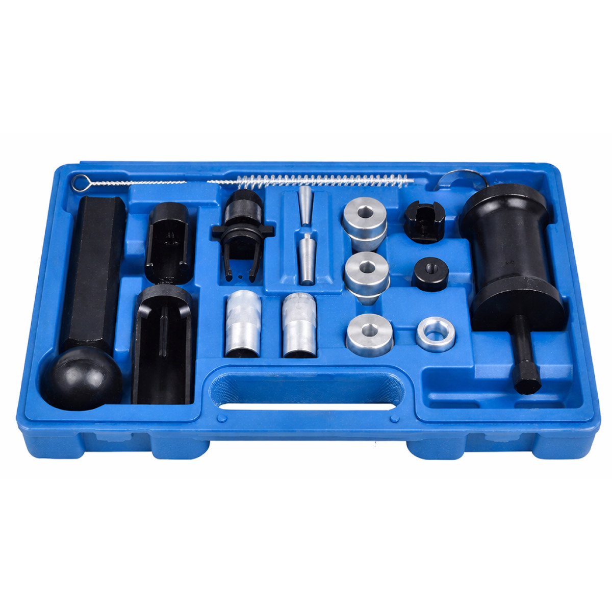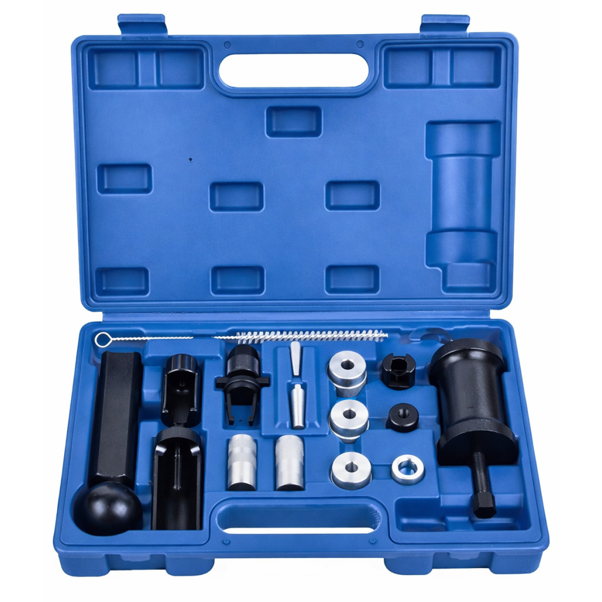 Набор для удаления форсунок VW AUDI предназначен для быстрого и профессионального демонтажа форсунок FSI и насос-форсунок на автомобилях Volkswagen, Audi, Seat, Skoda. Подходит для двигателей с непосредственным впрыском топлива, а также для большинства дизельных двигателей. Обеспечивает удобное снятие форсунок, установку уплотнительных колец камеры сгорания и демонтаж топливного насоса высокого давления.