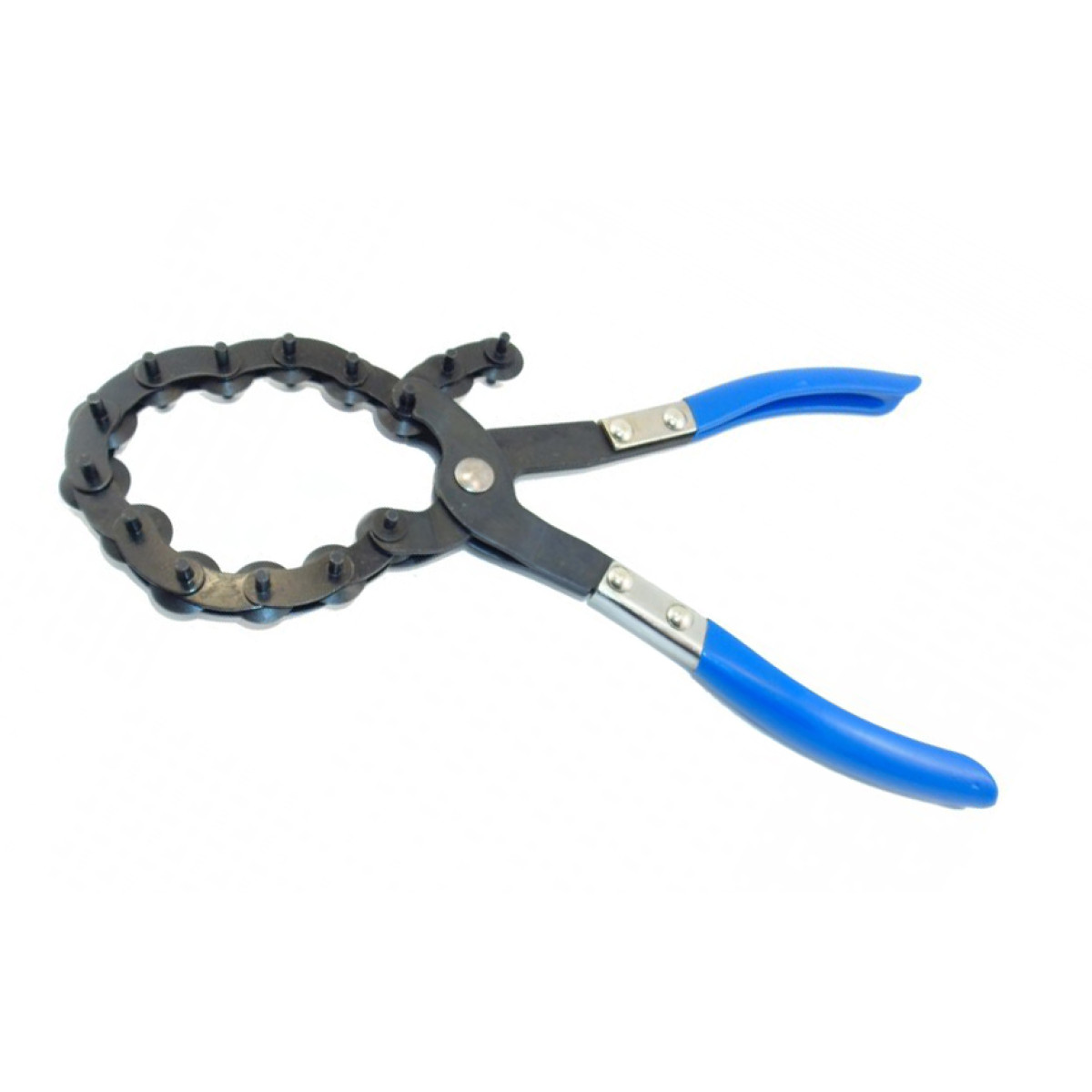 Устройство для резки выхлопных труб предназначено для быстрой и ровной резки тонкостенных труб при ремонте выхлопной системы автомобиля. Инструмент позволяет выполнять работы в ограниченном пространстве, где невозможно использовать стандартную ножовку или угловую шлифовальную машину. Цепной механизм с режущими роликами позволяет разрезать трубу путем вращения инструмента вокруг нее. Лезвия изготовлены из высококачественной закаленной стали HRC55, что обеспечивает высокую прочность, долговечность и чистый рез трубы. Инструмент широко используется в автомастерских для ремонта выхлопных систем, так как позволяет выполнять работы без демонтажа всей магистрали.