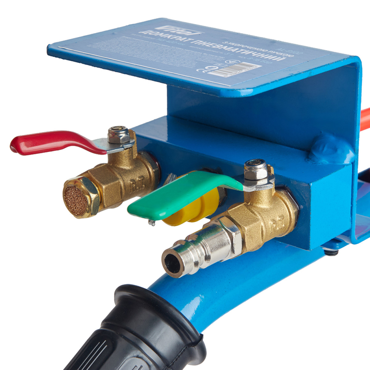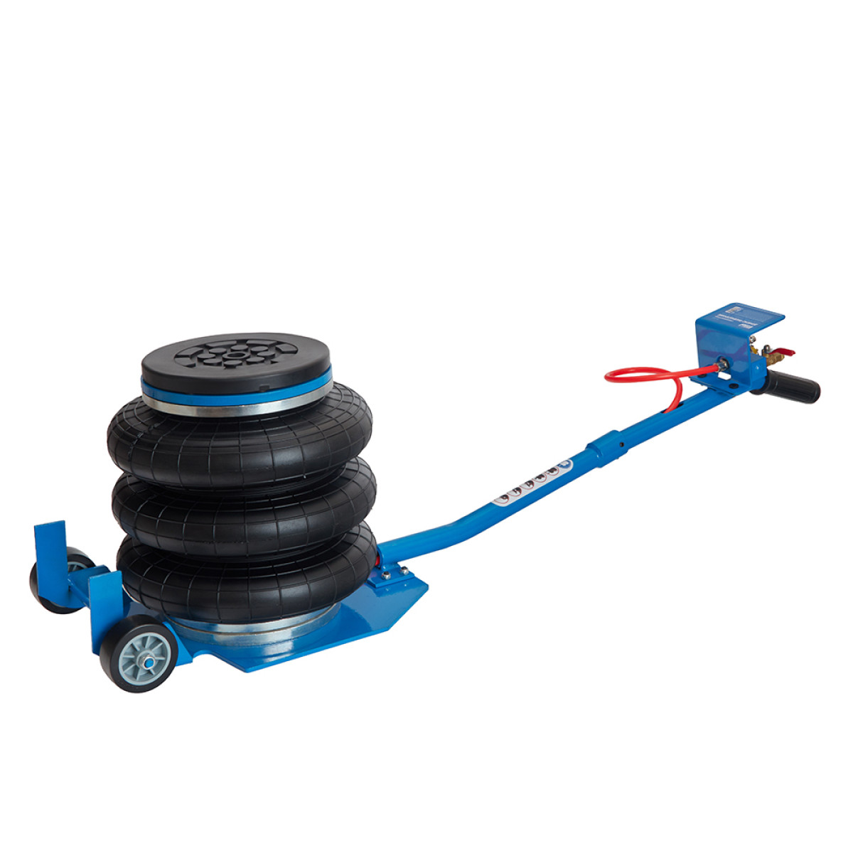 Пневматический домкрат предназначен для быстрого подъёма автомобилей весом до . Усиленная широкая платформа и три прочные резиновые подушки обеспечивают стабильность, безопасность и плавный ход. Отлично подходит для шиномонтажа, автосервиса и гаража.
